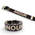 Das Halsband auf dem Bild besteht aus Biothane in der Farbe Schwarz, wurde mit Kunstleder in dunkler Leo Optik unterpolstert. Auf der Oberseite des Halsband werden Buchstaben ebenfalls aus Kunstleder in der Farbe Beige auf das Halsband aufgenäht. Was auf dem Halsband stehen soll entscheidest DU. Ob der Name deines Hundes oder ein anderes Wort. Das Halsband hat insgesamt 5 Löcher zum verstellen.