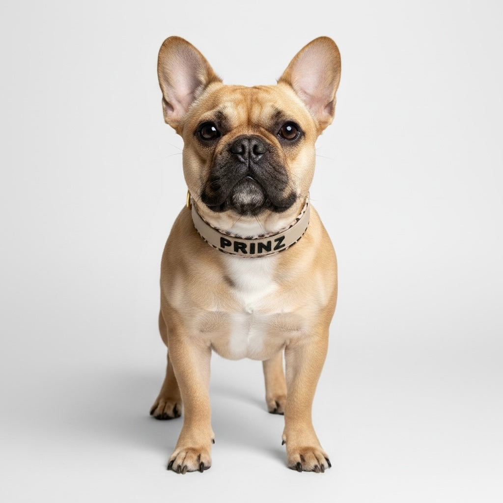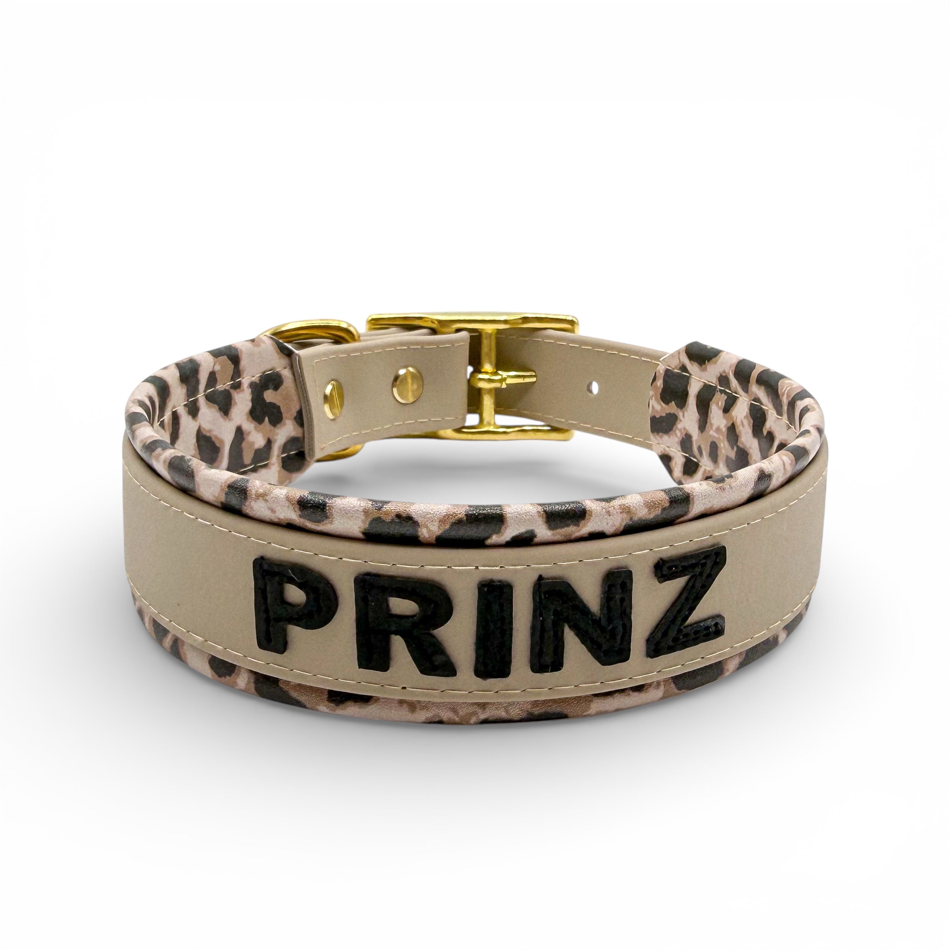 Das Halsband auf dem Bild besteht aus Biothane in der Farbe Taupe, wurde mit Kunstleder in dunkler Leo Optik unterpolstert. Auf der Oberseite des Halsband werden Buchstaben ebenfalls aus Kunstleder in der Farbe Beige auf das Halsband aufgenäht. Was auf dem Halsband stehen soll entscheidest DU. Ob der Name deines Hundes oder ein anderes Wort. Das Halsband hat insgesamt 5 Löcher zum verstellen.