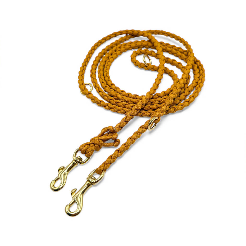 Die Leine auf dem Bild besteht rundegeflochtenem Paracord in der Farbe Mustard und hat eine Standardlänge von 220 cm und ist 3 fach verstellbar. An den Enden wurde sie Leine mit einem speziellen Knoten versehen.