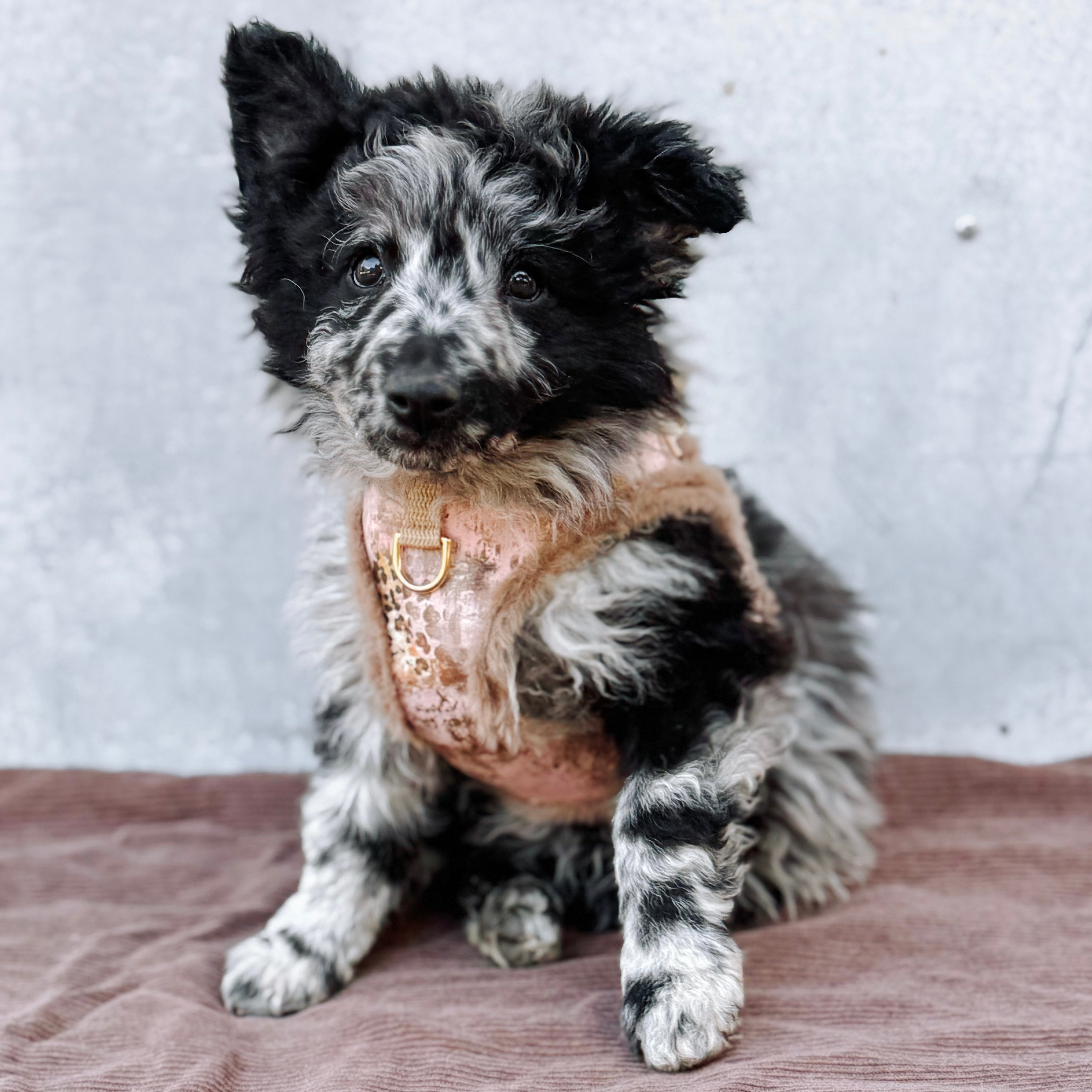 Das Softgeschirr auf dem Bild besteht aus Kunstleder in abstrakter Leo Optik und wurde mit dunkel beigem Kunstfell unterlegt. Als Verschluss dient ein Klettverschluss so wie ein Zusätzlicher Klickverschluss und zwei D-Ringen zum befestigen der der Leine.