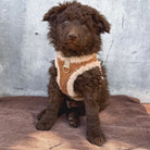 Das Softgeschirr auf dem Bild besteht aus Cord inder Farbe Ocker und wurde mit beigem Kunstfell unterlegt. Als Verschluss dient ein Klettverschluss so wie ein Zusätzlicher Klickverschluss und zwei D-Ringen zum befestigen der der Leine.