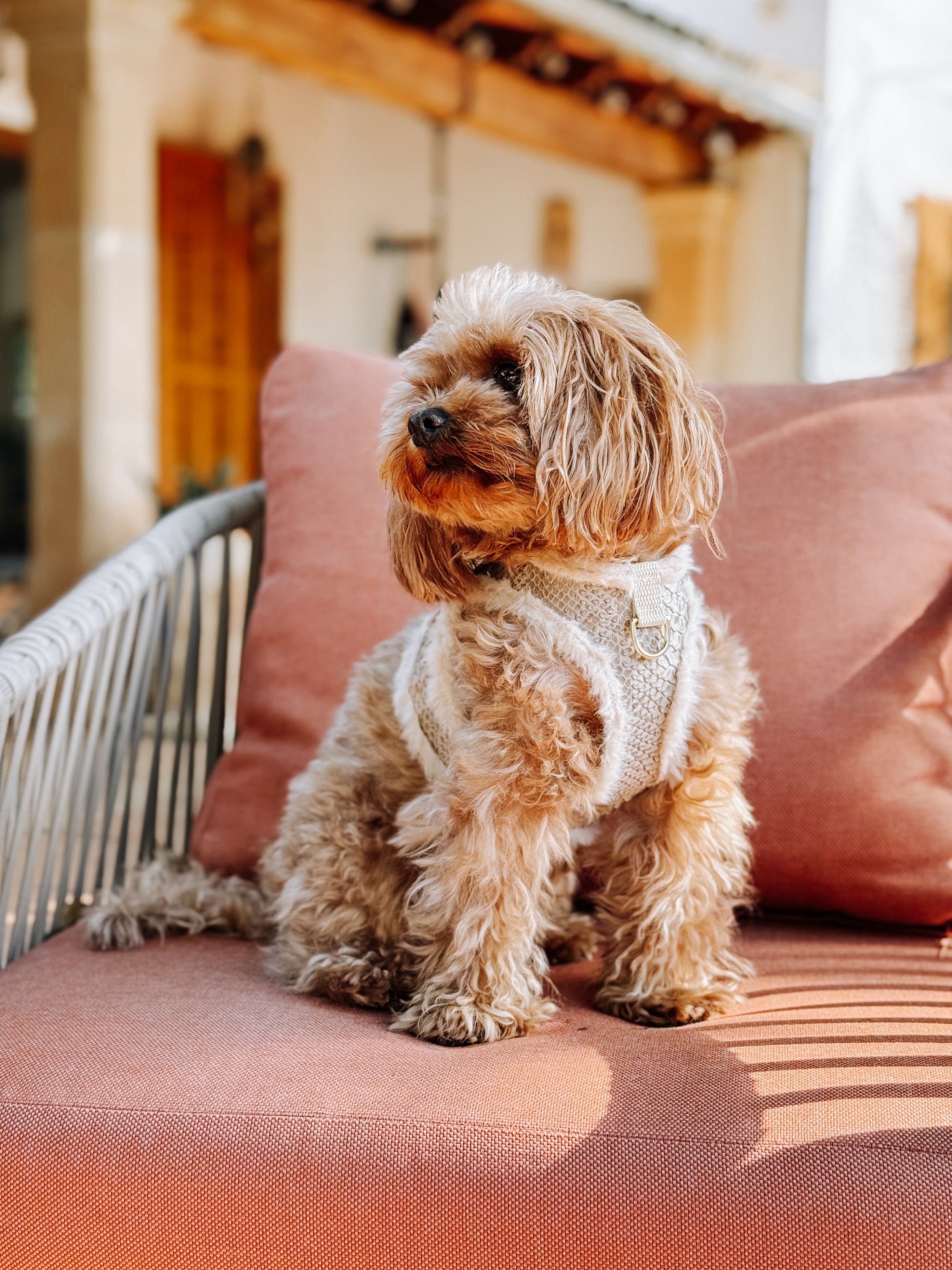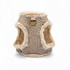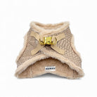 Das Softgeschirr auf dem Bild besteht aus Kunstleder in Krokooptik in der Farbe Beige und wurde mit beigen Kunstfell unterlegt. Als Verschluss dient ein Klettverschluss so wie ein Zusätzlicher Klickverschluss und zwei D-Ringen zum befestigen der der Leine.