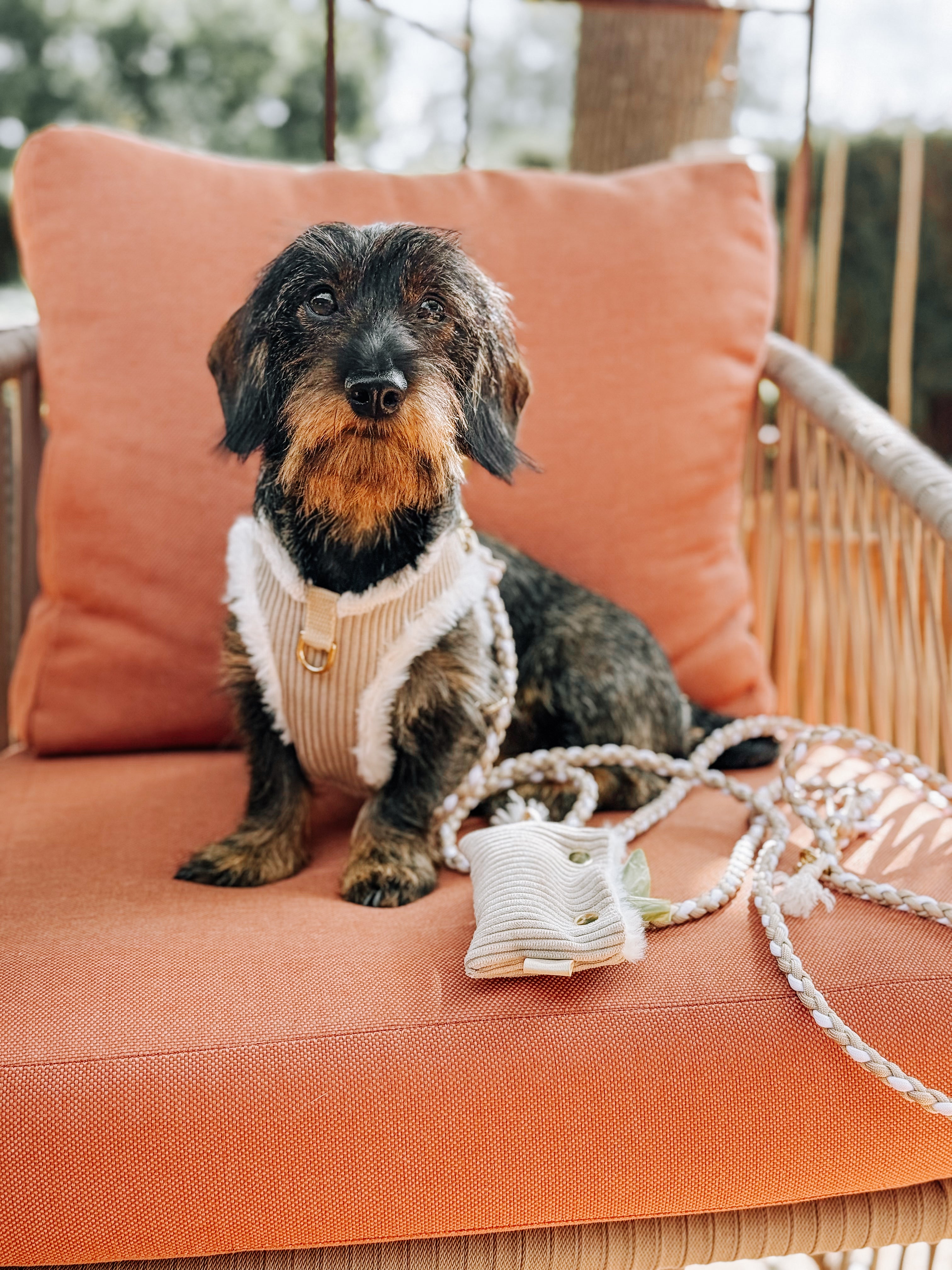 Das Softgeschirr auf dem Bild besteht aus Cord inder Farbe Sand und wurde mit beigem Kunstfell unterlegt. Als Verschluss dient ein Klettverschluss so wie ein Zusätzlicher Klickverschluss und zwei D-Ringen zum befestigen der der Leine.