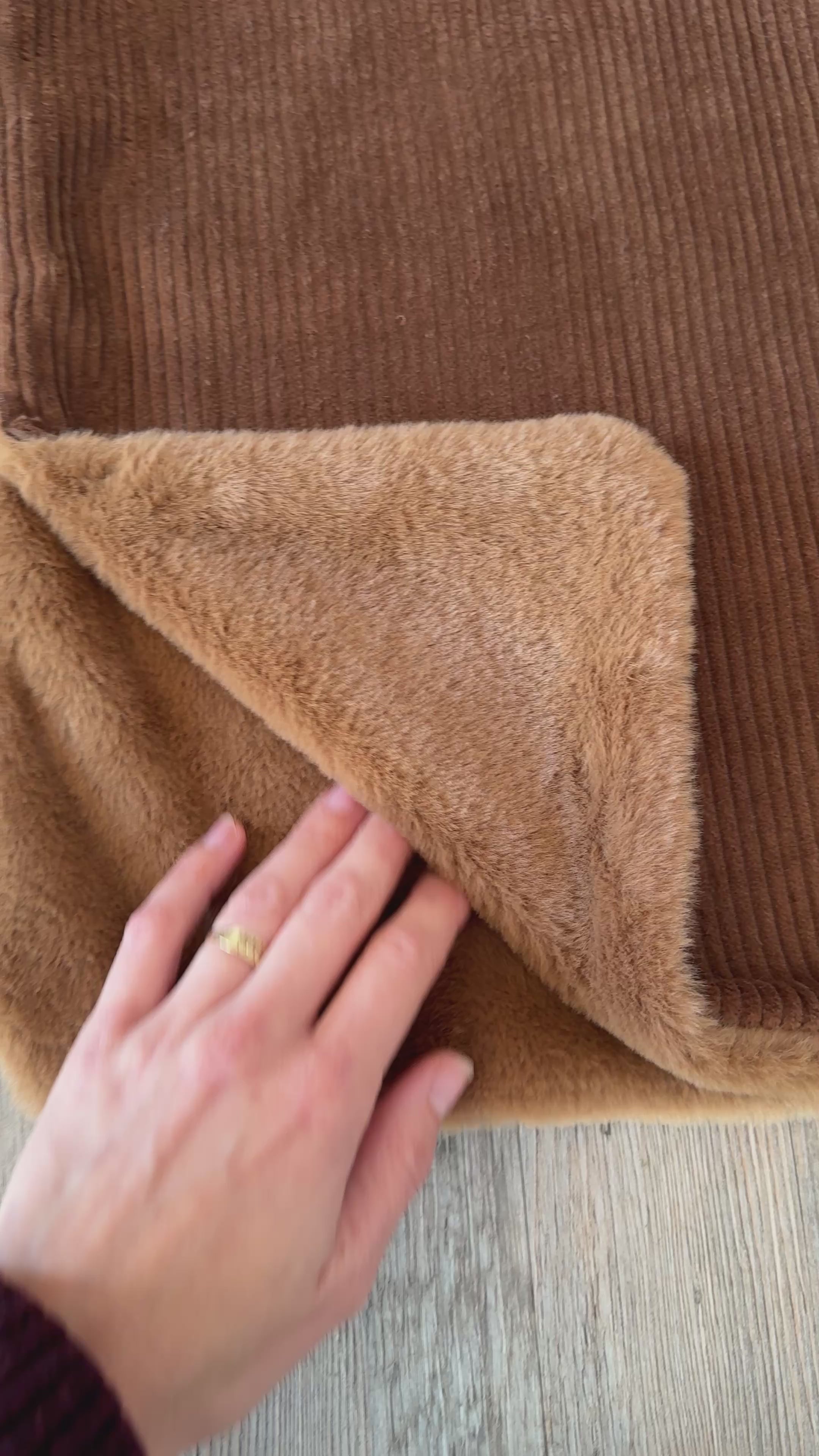 Bei dieser handgefertigten Hundedecke besteht die eine Seite aus Cord in der Farbe Braun und die andere Seite aus super weichem Kunstfell in Braun und ca. die Maße von 70x100 cm.