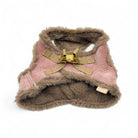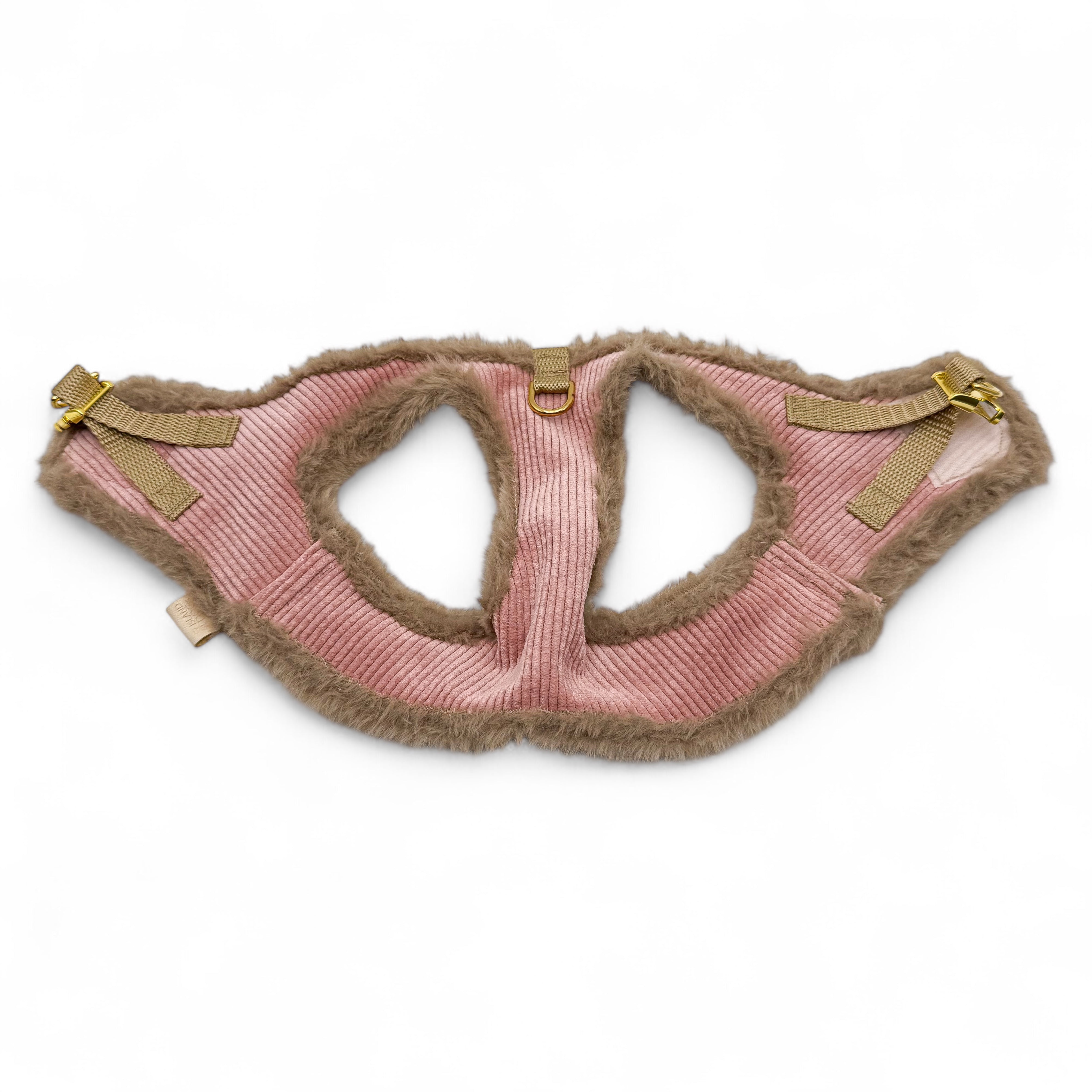 Das Softgeschirr auf dem Bild besteht aus Cord inder Farbe Altrosa und wurde mit Kunstfell in dunkel Beige unterlegt. Als Verschluss dient ein Klettverschluss so wie ein Zusätzlicher Klickverschluss und zwei D-Ringen zum befestigen der der Leine.