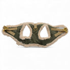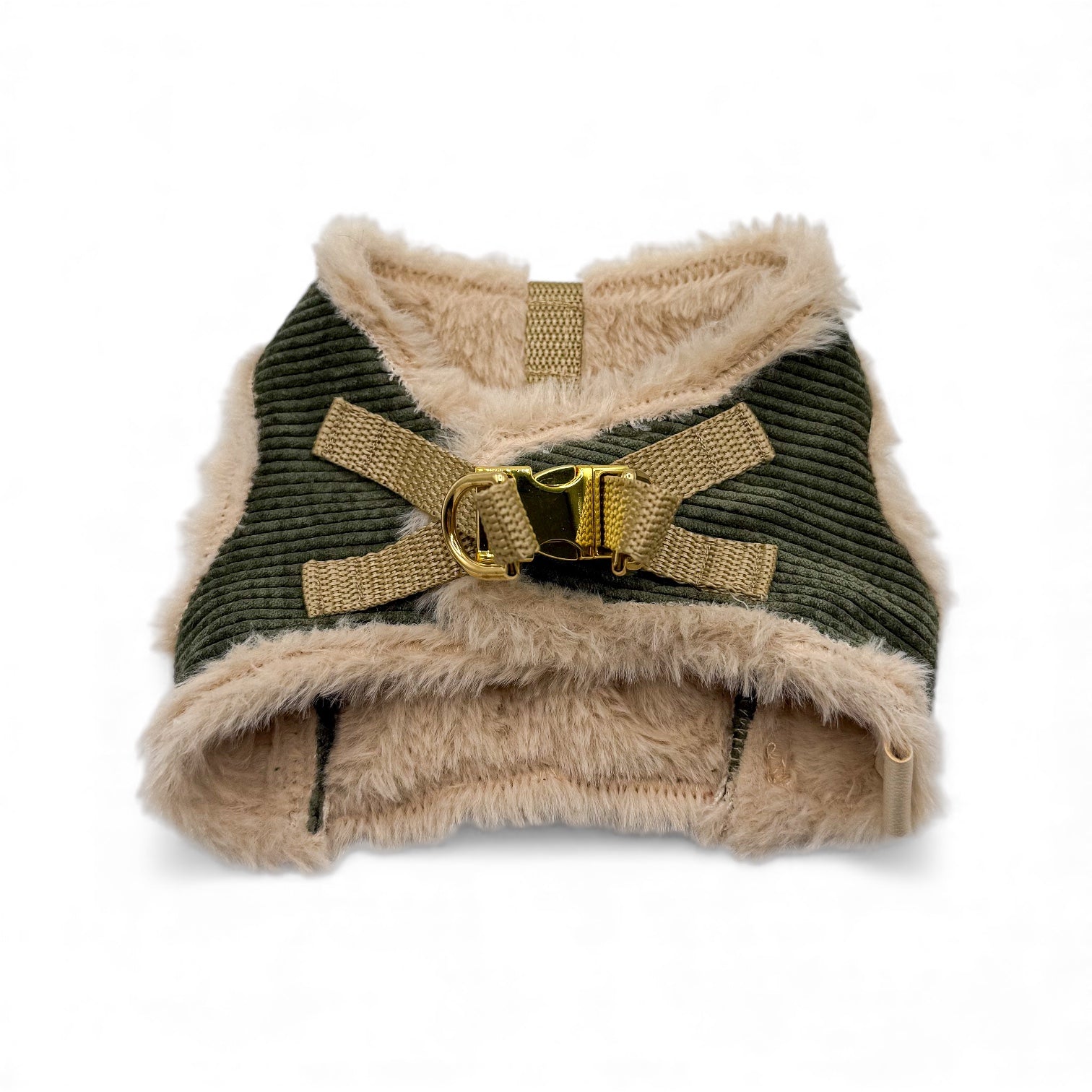 Das Softgeschirr auf dem Bild besteht aus Cord in der Farbe Dunkelgrün und wurde mit beigem Kunstfell unterlegt. Als Verschluss dient ein Klettverschluss so wie ein Zusätzlicher Klickverschluss und zwei D-Ringen zum befestigen der der Leine.