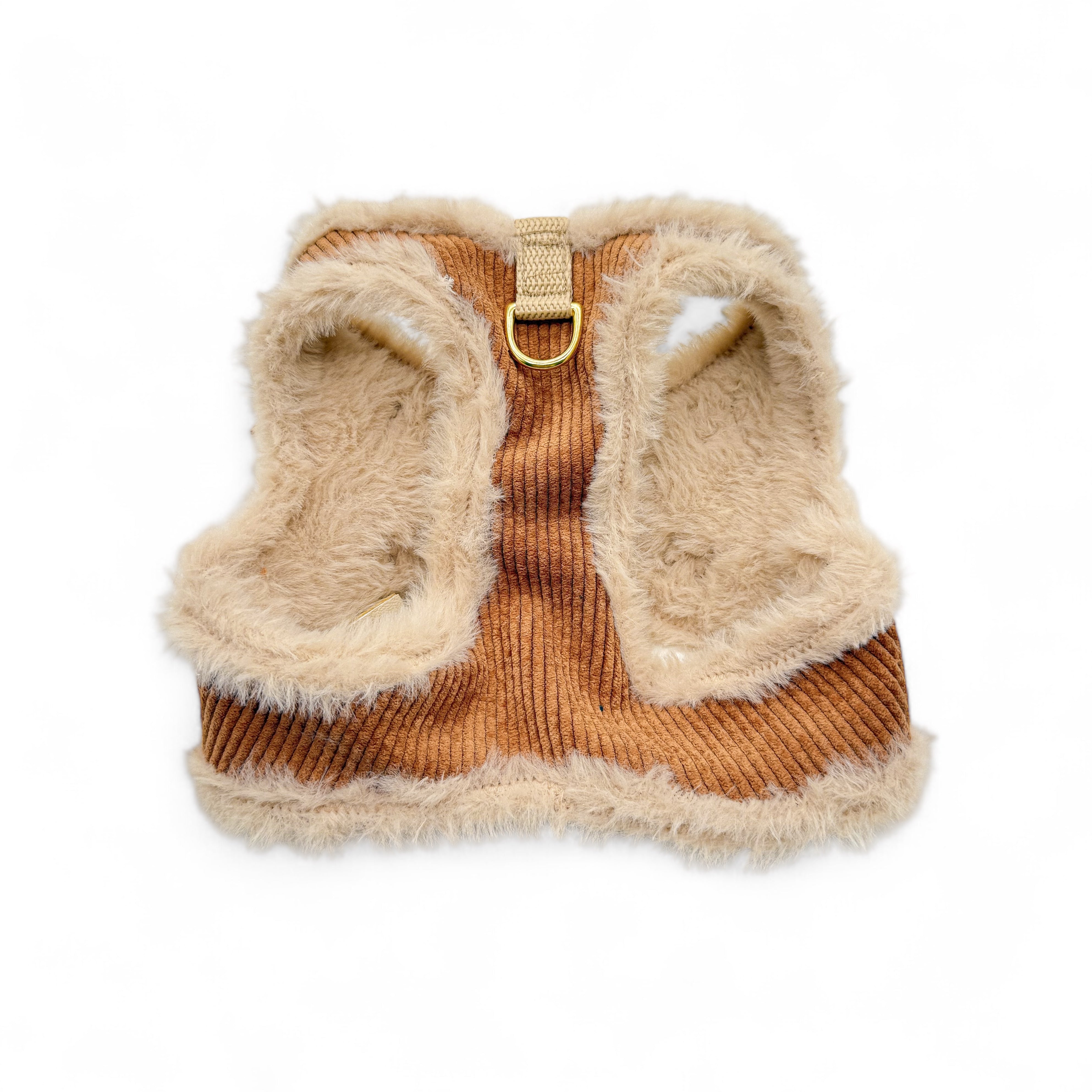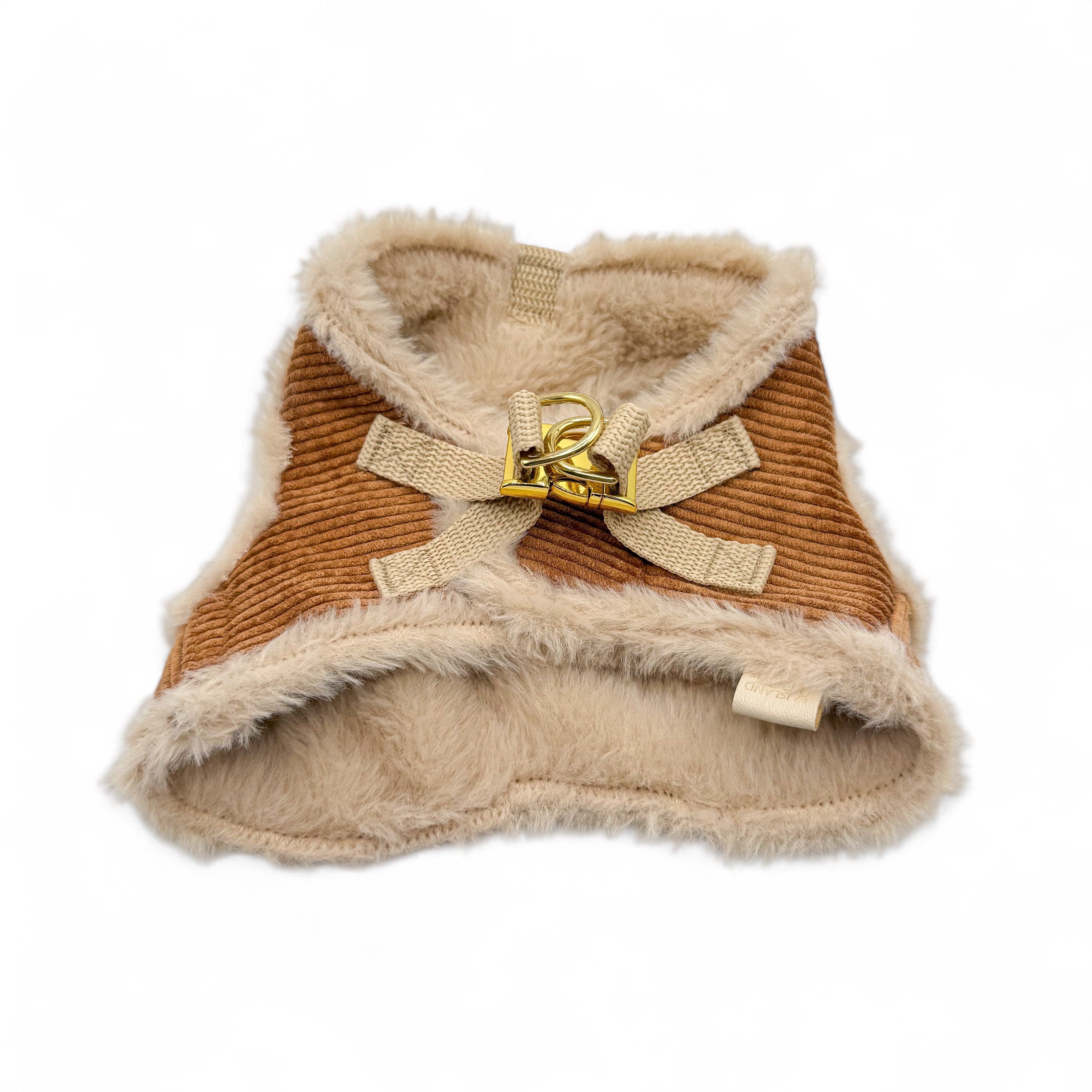 Das Softgeschirr auf dem Bild besteht aus Cord inder Farbe Ocker und wurde mit beigem Kunstfell unterlegt. Als Verschluss dient ein Klettverschluss so wie ein Zusätzlicher Klickverschluss und zwei D-Ringen zum befestigen der der Leine.