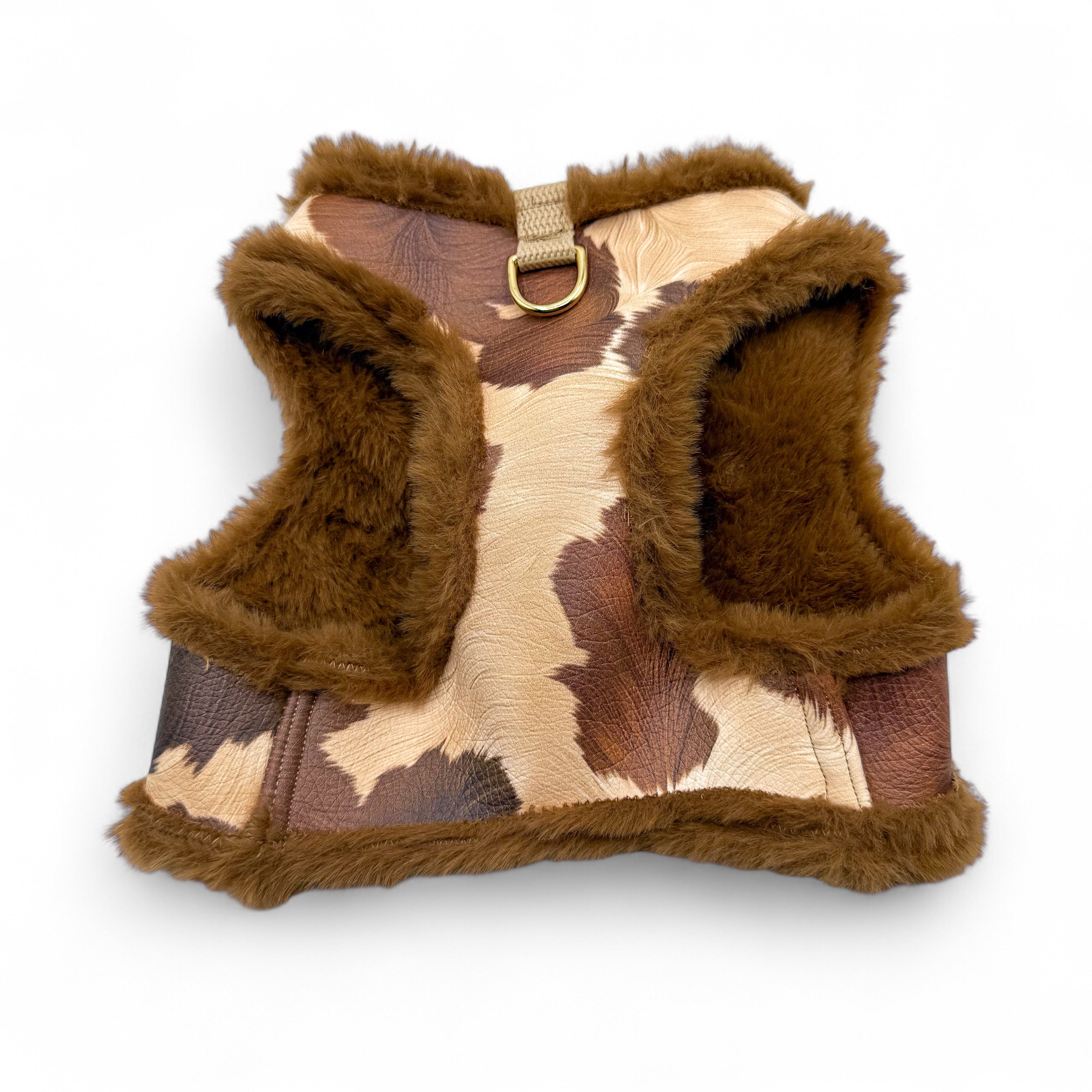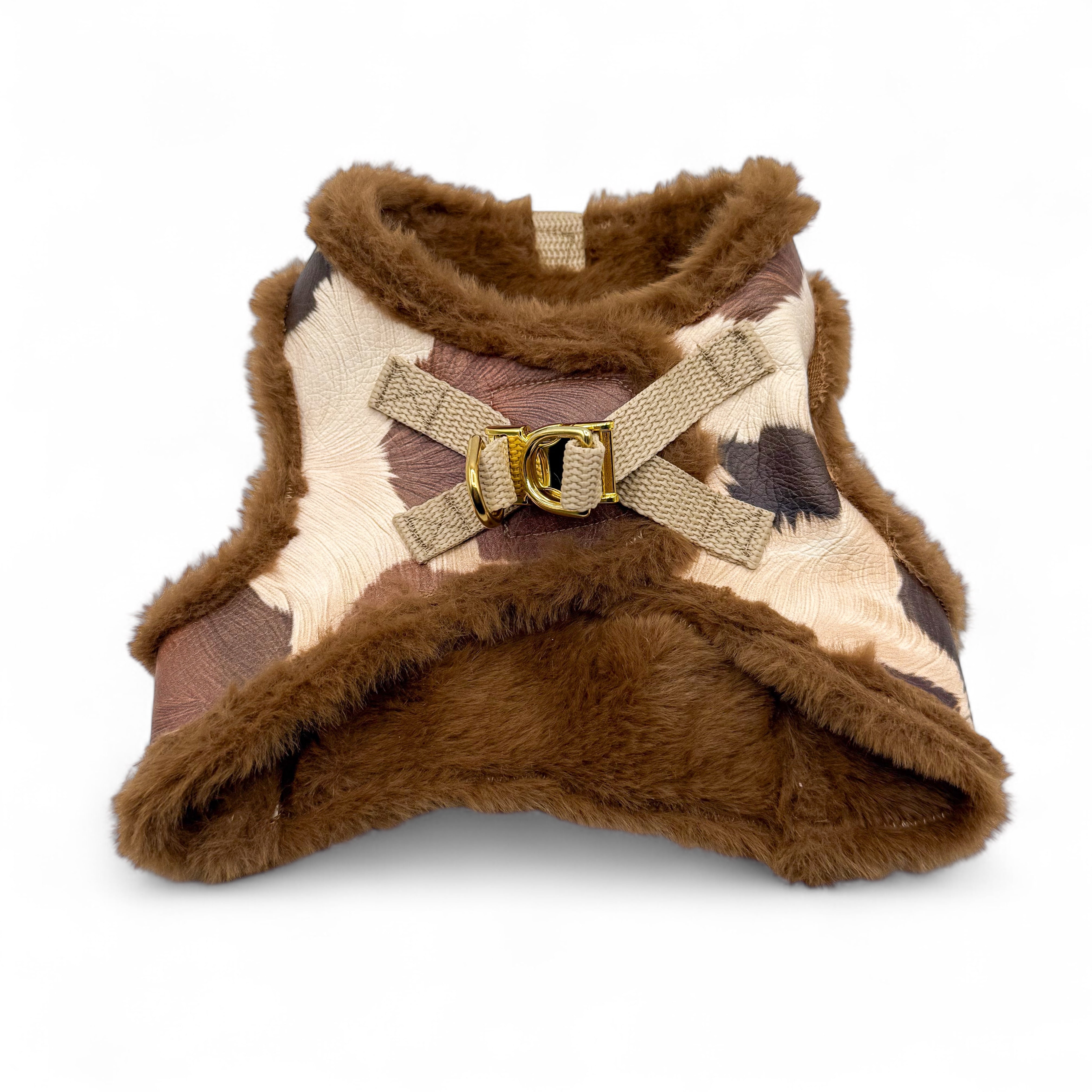 Das Softgeschirr auf dem Bild besteht aus Kunstleder in Kuhfelloptik und wurde mit braunem Kusntefell unterlegt. Als Verschluss dient ein Klettverschluss so wie ein Zusätzlicher Klickverschluss und zwei D-Ringen zum befestigen der der Leine.