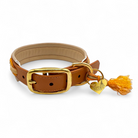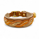 Das Halsband auf dem Bild besteht aus Biothane in der Farbe Cognac und wurde mit Paracordand im Wave Look verziert. Das Halsband ist außerdem mit einer weichen Kunstlederpolsterung in Beige versehen und ermöglicht so einen super angenehmen Tragekomfort für deinen Hund. Paracord, Biothane und Polsterung sind komplett vernäht. Als Verschluss ist eine Doppelstegschnalle angebracht die das Halsband mehrfach verstellbar macht.