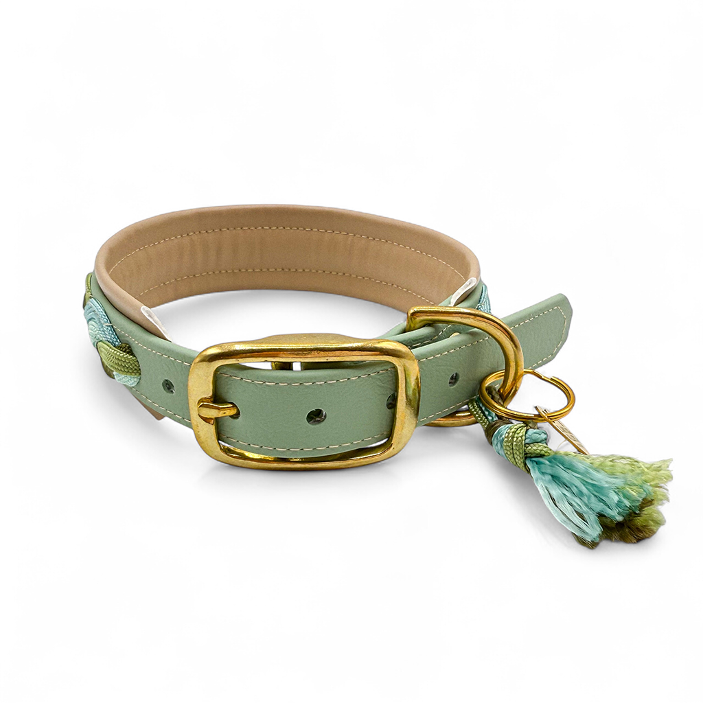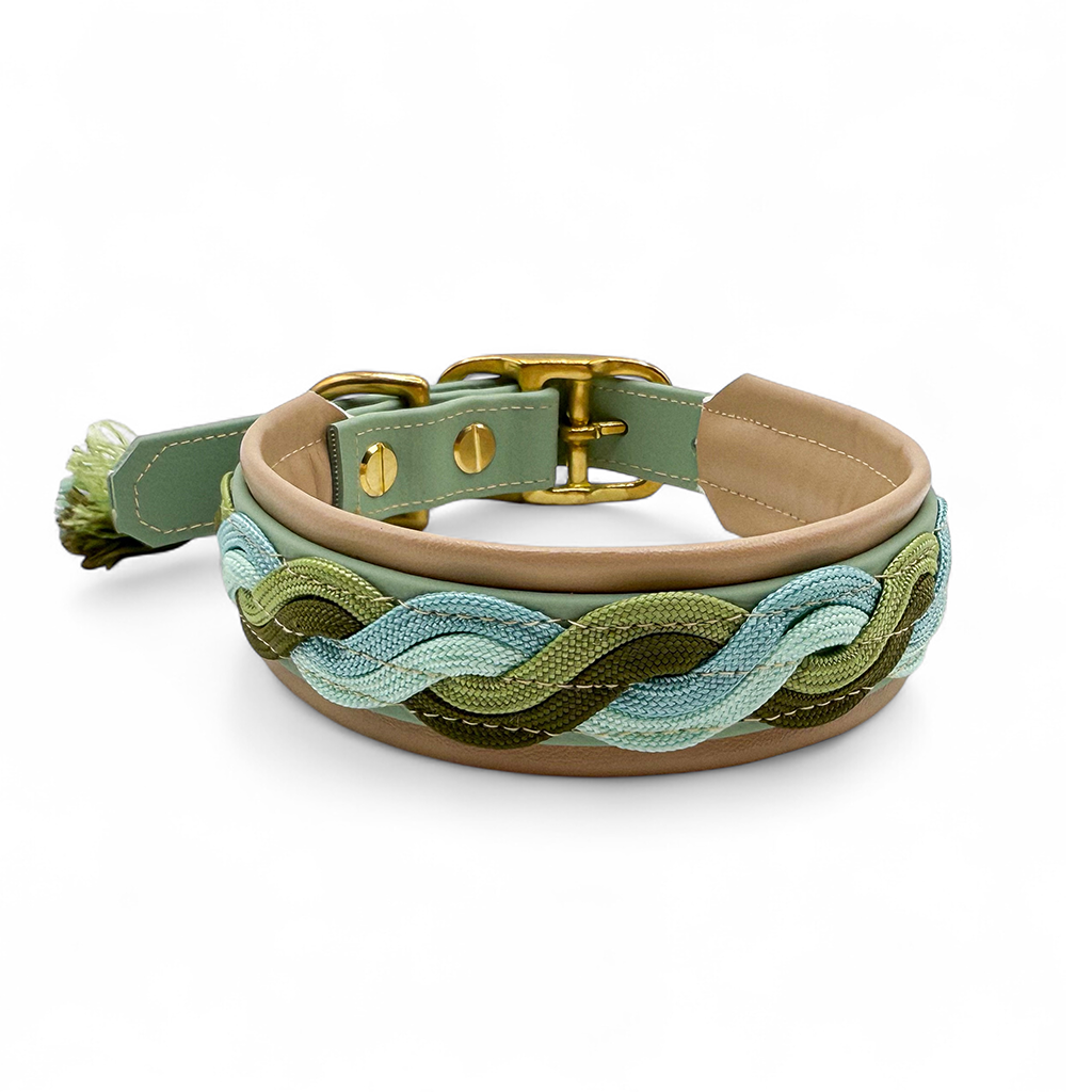 Das Halsband auf dem Bild besteht aus Biothane in der Farbe Salbei und wurde mit Paracordand im Wave Look verziert. Das Halsband ist außerdem mit einer weichen Kunstlederpolsterung in Beige versehen und ermöglicht so einen super angenehmen Tragekomfort für deinen Hund. Paracord, Biothane und Polsterung sind komplett vernäht. Als Verschluss ist eine Doppelstegschnalle angebracht die das Halsband mehrfach verstellbar macht.
