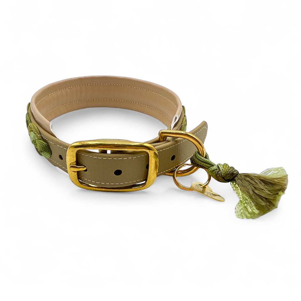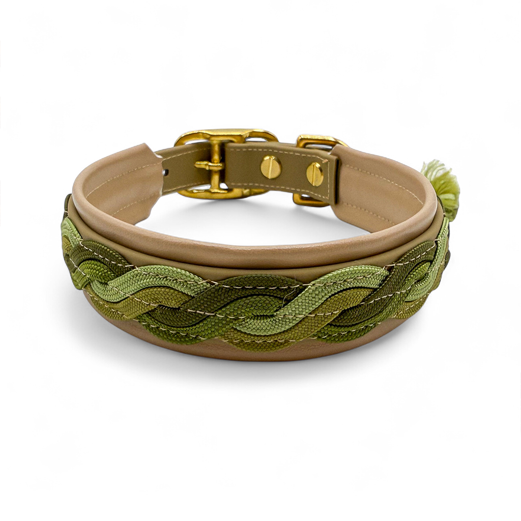 Das Halsband auf dem Bild besteht aus Biothane in der Farbe Kaki und wurde mit Paracordand im Wave Look verziert. Das Halsband ist außerdem mit einer weichen Kunstlederpolsterung in Beige versehen und ermöglicht so einen super angenehmen Tragekomfort für deinen Hund. Paracord, Biothane und Polsterung sind komplett vernäht. Als Verschluss ist eine Doppelstegschnalle angebracht die das Halsband mehrfach verstellbar macht.