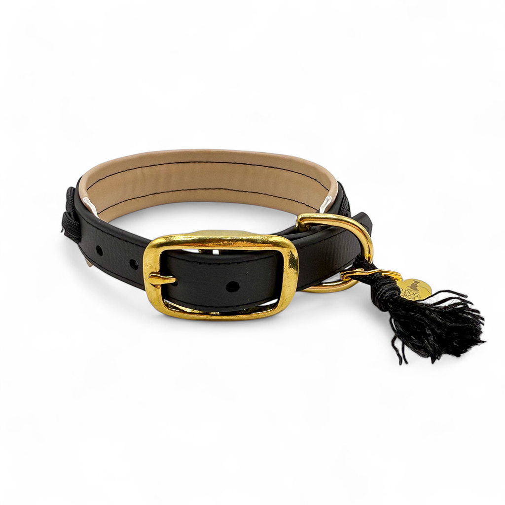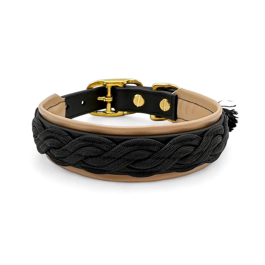 Das Halsband auf dem Bild besteht aus Biothane in der Farbe Schwarz und wurde mit Paracordand im Wave Look verziert. Das Halsband ist außerdem mit einer weichen Kunstlederpolsterung in Beige versehen und ermöglicht so einen super angenehmen Tragekomfort für deinen Hund. Paracord, Biothane und Polsterung sind komplett vernäht. Als Verschluss ist eine Doppelstegschnalle angebracht die das Halsband mehrfach verstellbar macht.