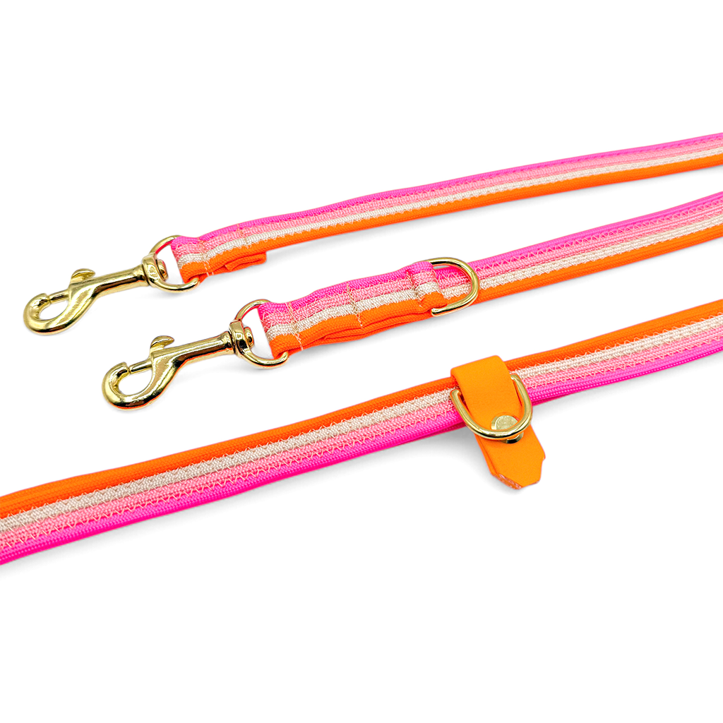 Die Leine auf dem Bild besteht aus Paracordband in den Farben Neon Pink, Peony Rosa, Cream und Goldfisch Orange. Die Paracordbänder wurden mit einer Zickzack Naht zusammengenäht und durch den angebrachten Schieber ist die Leine auf der ganzen Länge stufenlos verstellbar. Die Leine hat eine Länge von 2,20 m.