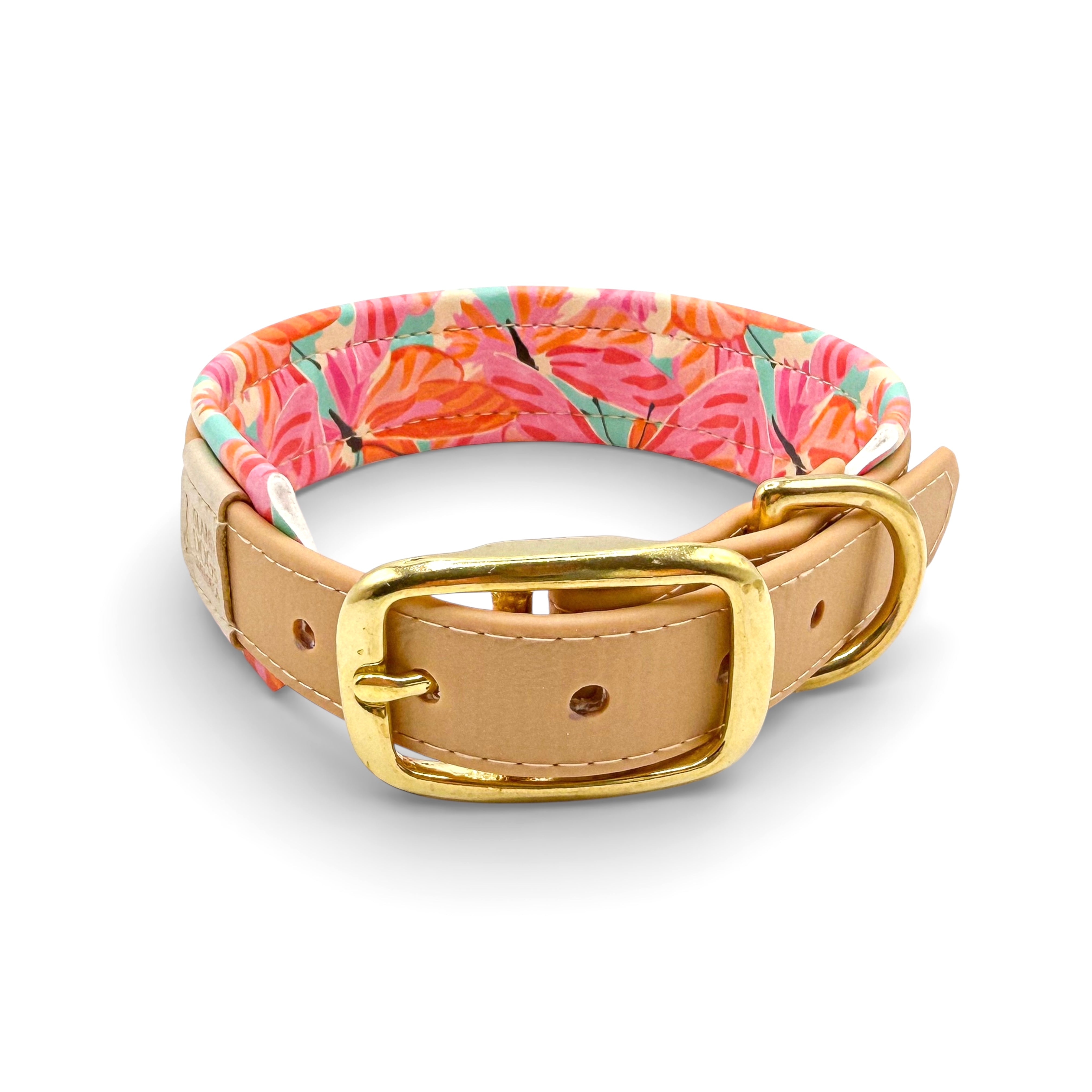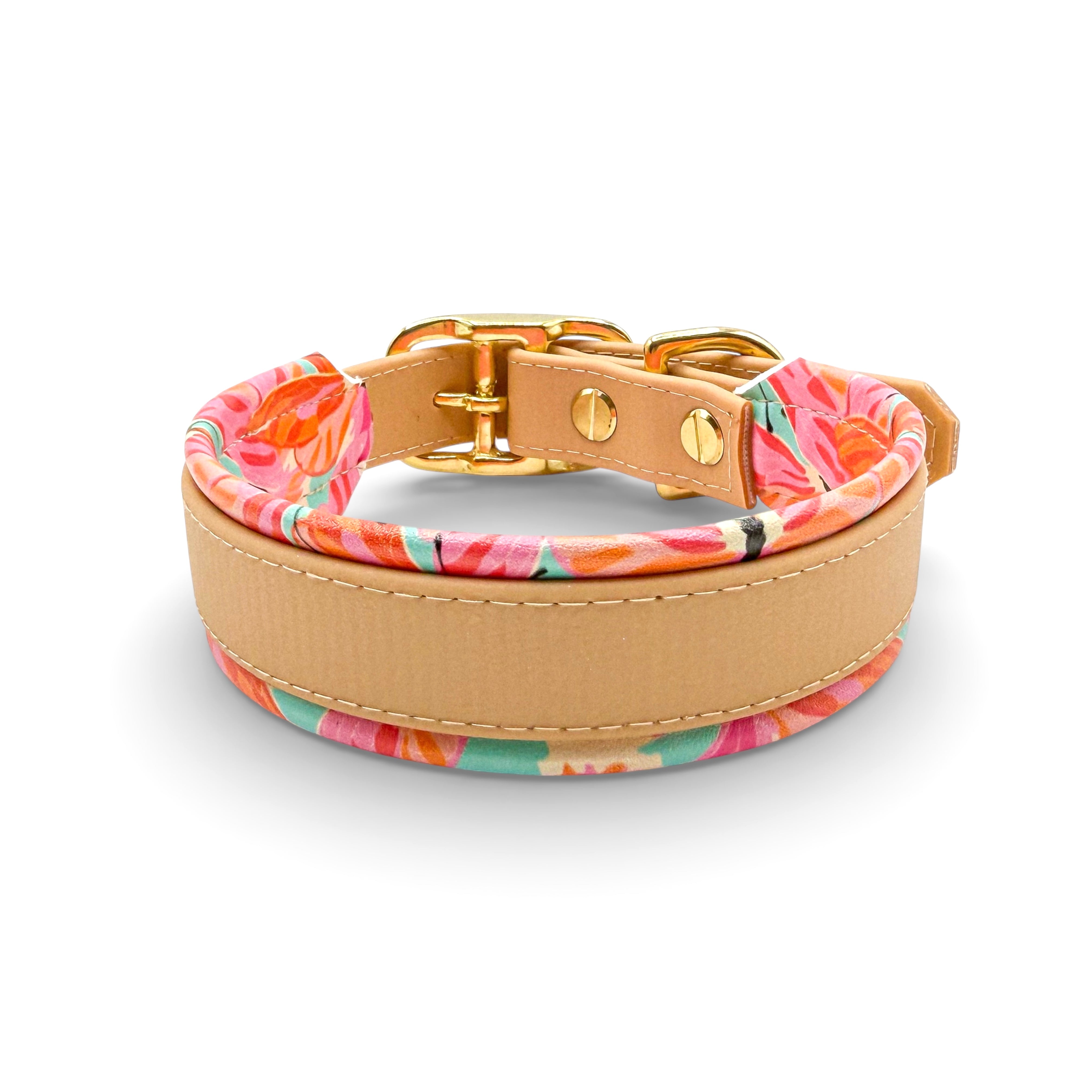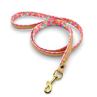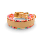 Material: Biothane in der Farbe Light Gold, Kunstleder im Hawai Muster, Beschläge aus Messing