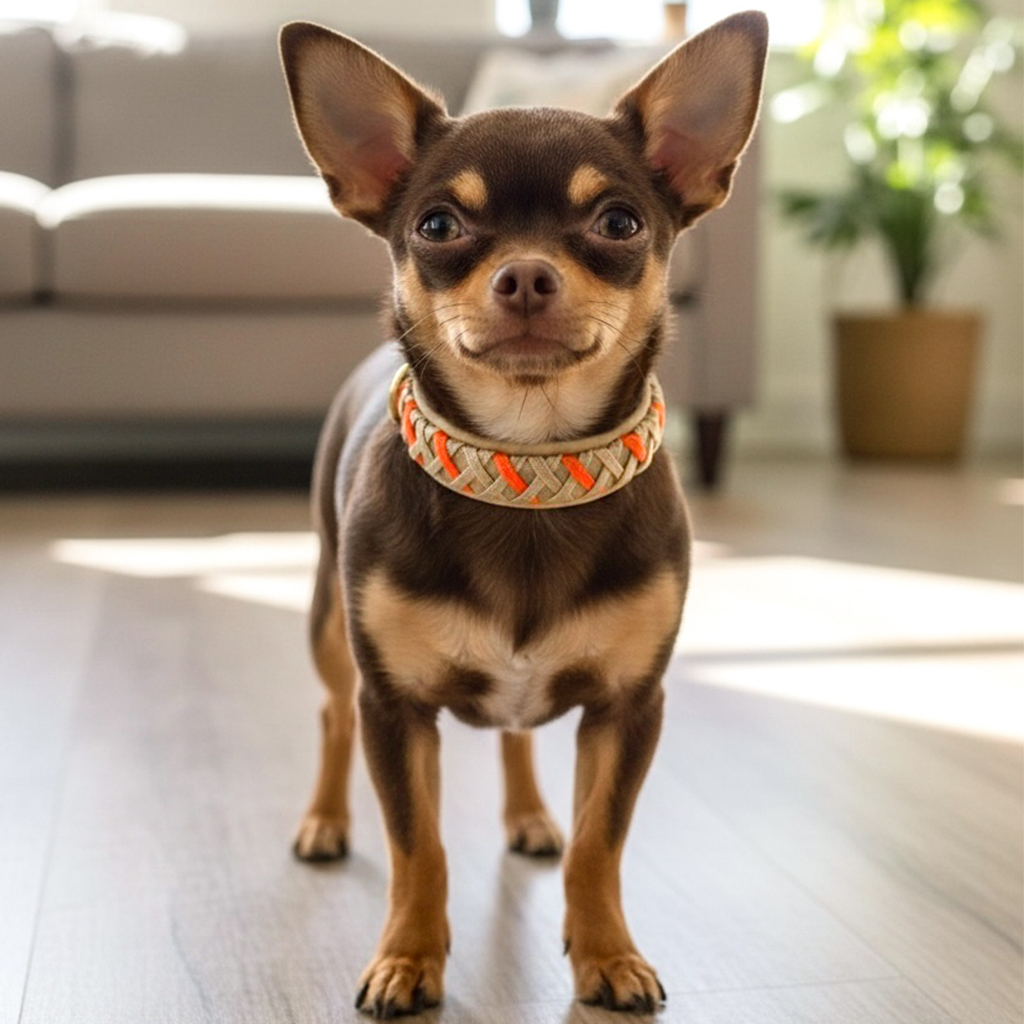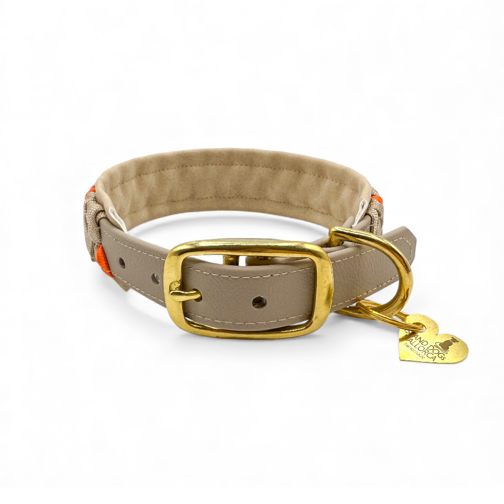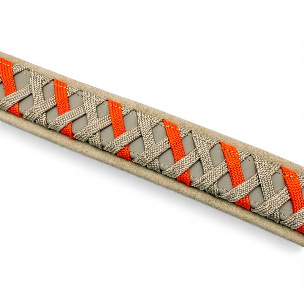Das Halsband auf dem Bild besteht aus Biothane in der Farbe Taupe und wurde mit Paracordand im im Felchtmuster verziert. Das Halsband ist außerdem mit einer weichen Kunstlederpolsterung in Hellbraun versehen und ermöglicht so einen super angenehmen Tragekomfort für deinen Hund. Paracord, Biothane und Polsterung sind komplett vernäht. Als Verschluss ist eine Doppelstegschnalle angebracht die das Halsband mehrfach verstellbar macht.