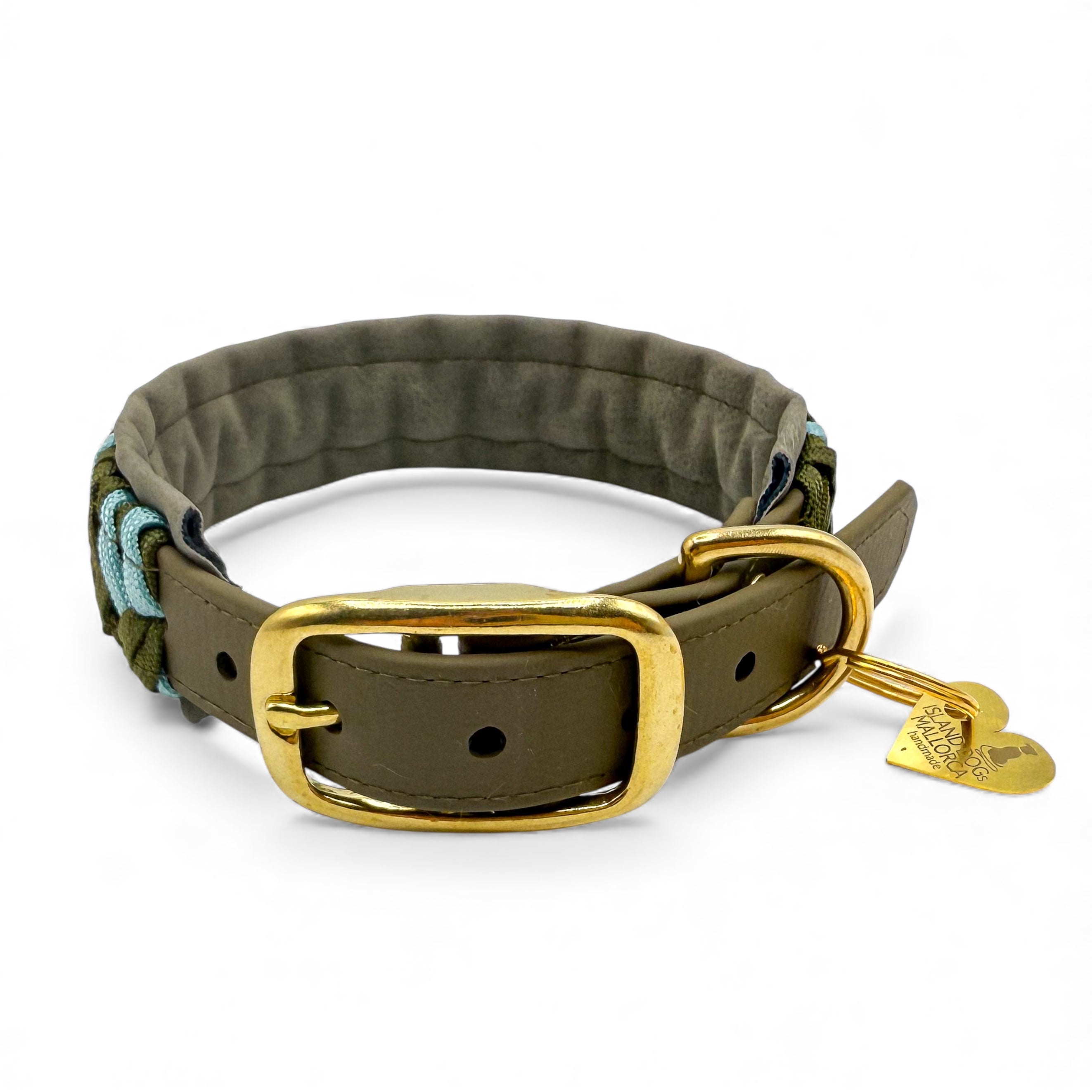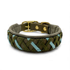 Das Halsband auf dem Bild besteht aus Biothane in der Farbe Olive und wurde mit Paracordand im im Flechtmuster verziert. Das Halsband ist außerdem mit einer weichen Kunstlederpolsterung in Dunkelgrün versehen und ermöglicht so einen super angenehmen Tragekomfort für deinen Hund. Paracord, Biothane und Polsterung sind komplett vernäht. Als Verschluss ist eine Doppelstegschnalle angebracht die das Halsband mehrfach verstellbar macht.