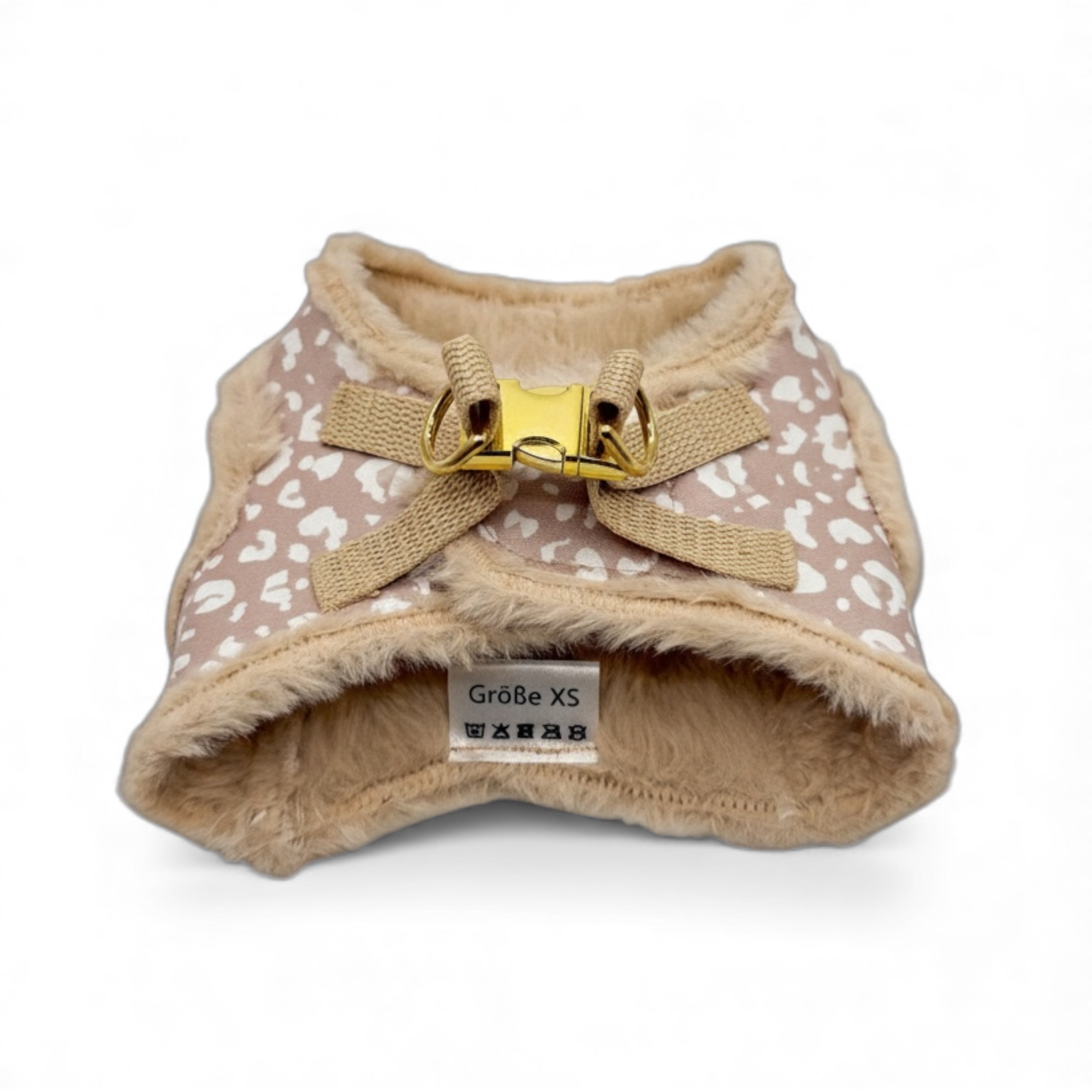 Das Softgeschirr auf dem Bild besteht aus Kunstleder im Leo Beige Muster und wurde mit beigem Kunstfell unterlegt. Als Verschluss dient ein Klettverschluss so wie ein Zusätzlicher Klickverschluss und zwei D-Ringen zum befestigen der der Leine.