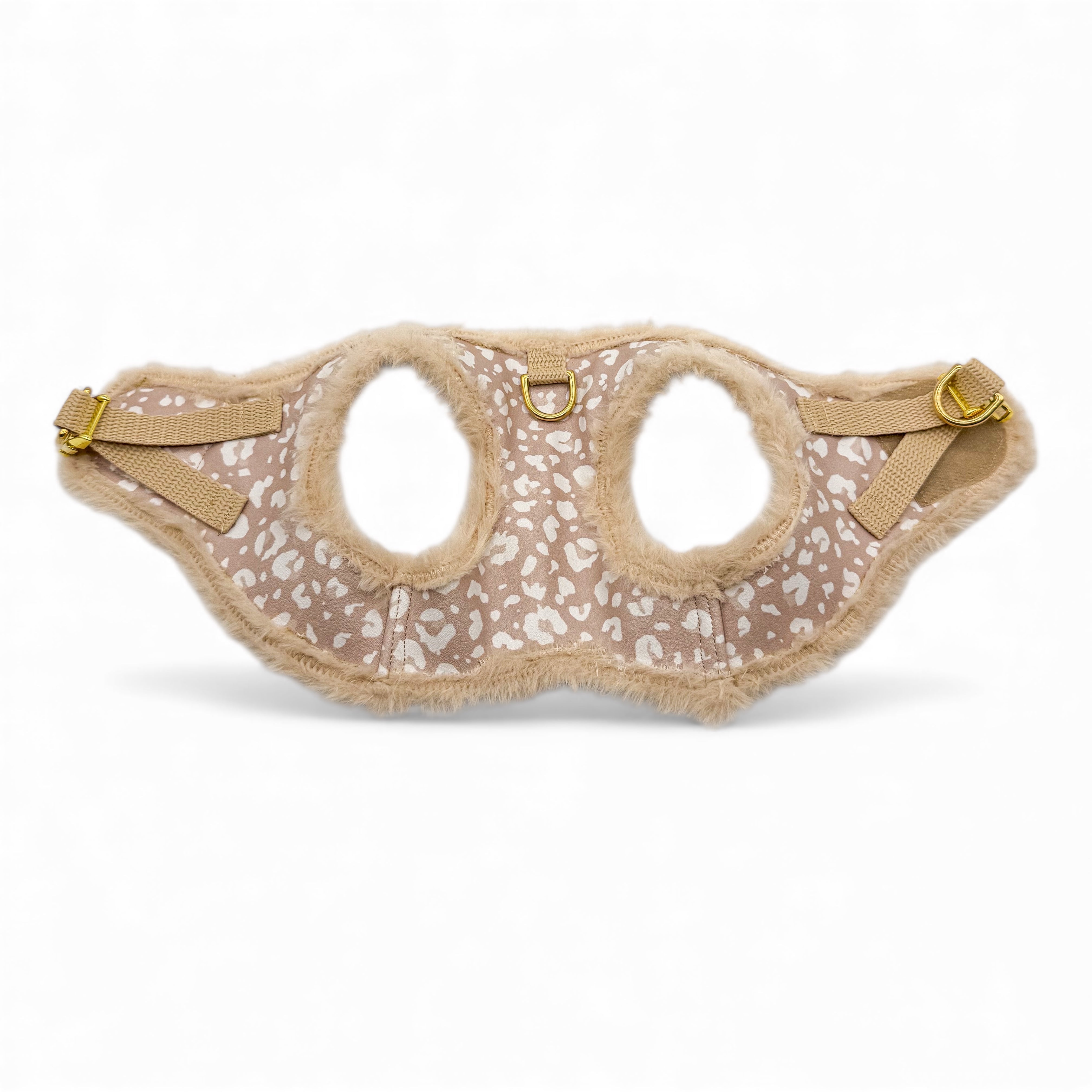 Das Softgeschirr auf dem Bild besteht aus Kunstleder im Leo Beige Muster und wurde mit beigem Kunstfell unterlegt. Als Verschluss dient ein Klettverschluss so wie ein Zusätzlicher Klickverschluss und zwei D-Ringen zum befestigen der der Leine.