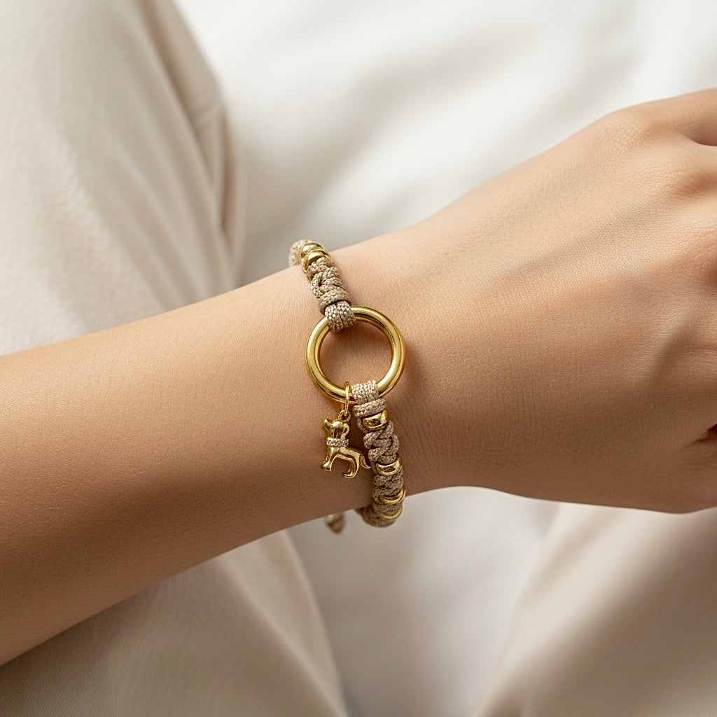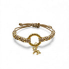 Dieses stylische Armband besteht aus geknotetem Paracord mit einem Messingring in der Mitte und 18 Karat vergoldeten Details so wie einem Charm in From eines Hundes. Das Armband ist durch den angebrachten Makrameknoten einfach an und auszuziehen.