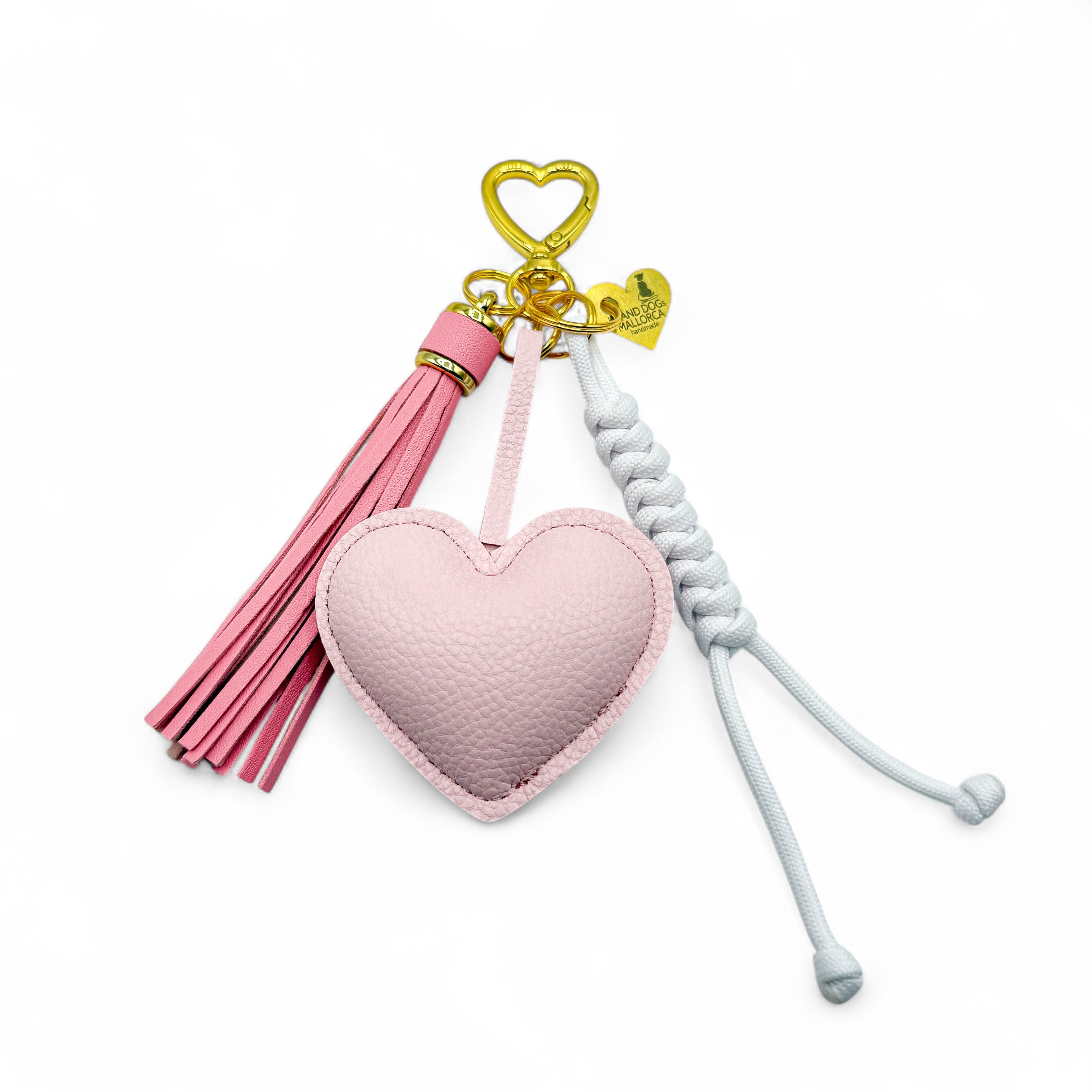 Dieser stylische Taschenanhänger besteht aus einem Herz aus Leder in Rosa, einer Quaste in Rosa, einem Paracordanhänger in Weiß und einem Herzkarabiner an dem alle Einzelteile befetigt sind.