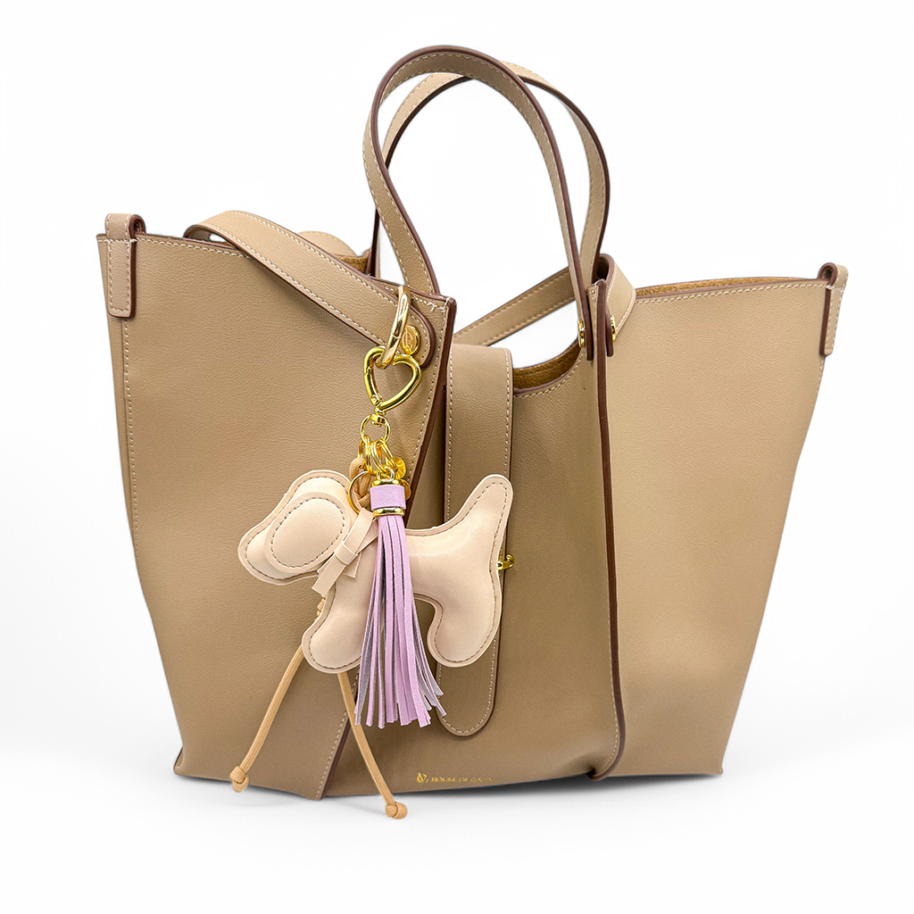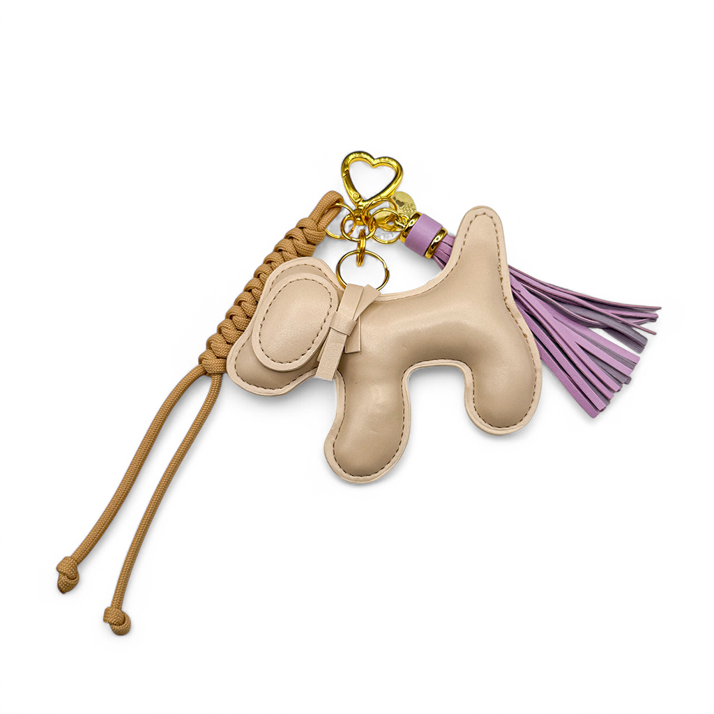 Dieser stylische Taschenanhänger besteht aus einem Hunde in Creme, einer Quaste in Flieder, einem Paracordanhänger in Sandgold und einem Herzkarabiner an dem alle einzelteile befetigt sind.