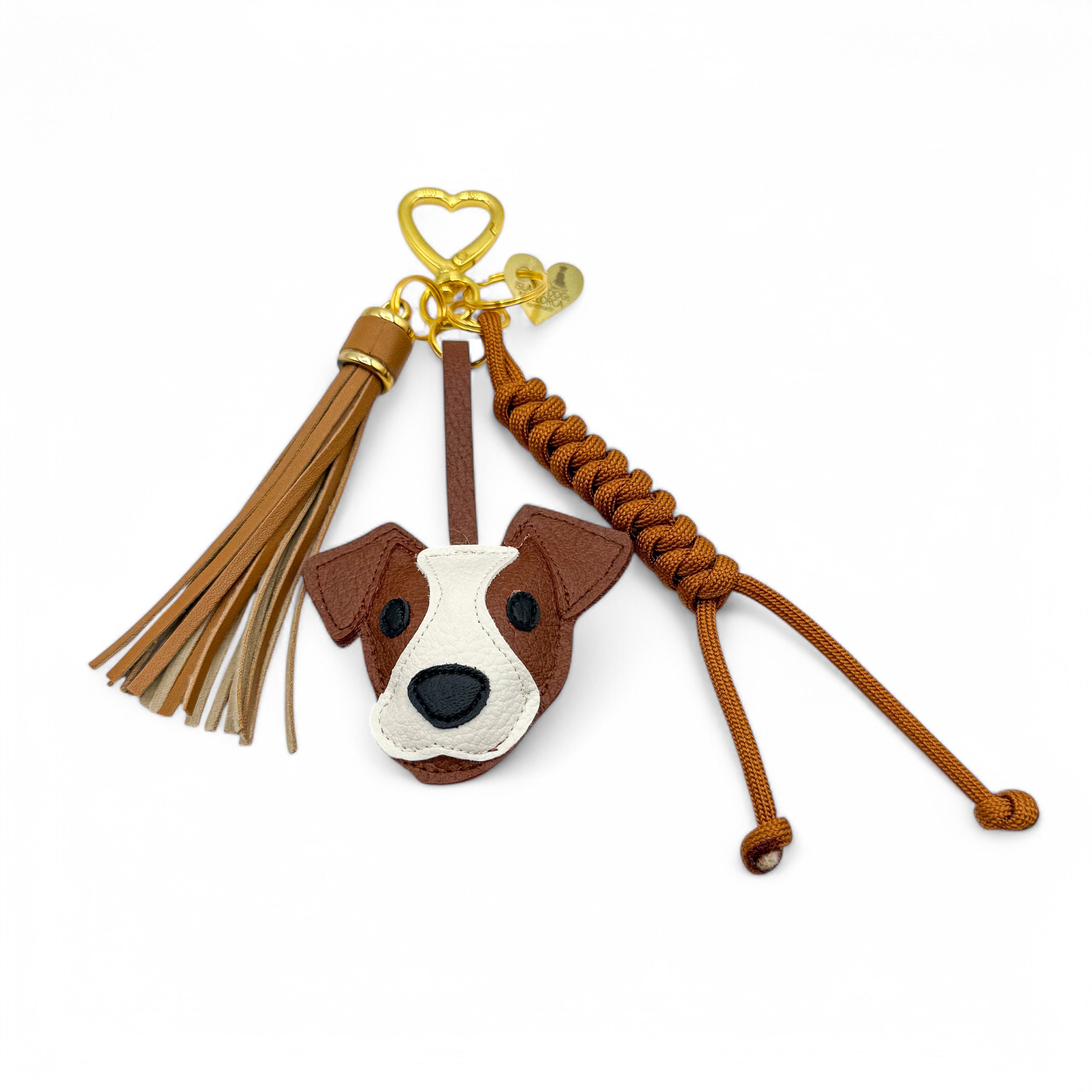 Dieser stylische Taschenanhänger besteht aus Jack Russel Hundekopf, einer Quaste in Braun, einem Paracordanhänger in Bronze und einem Herzkarabiner an dem alle Einzelteile befetigt sind.