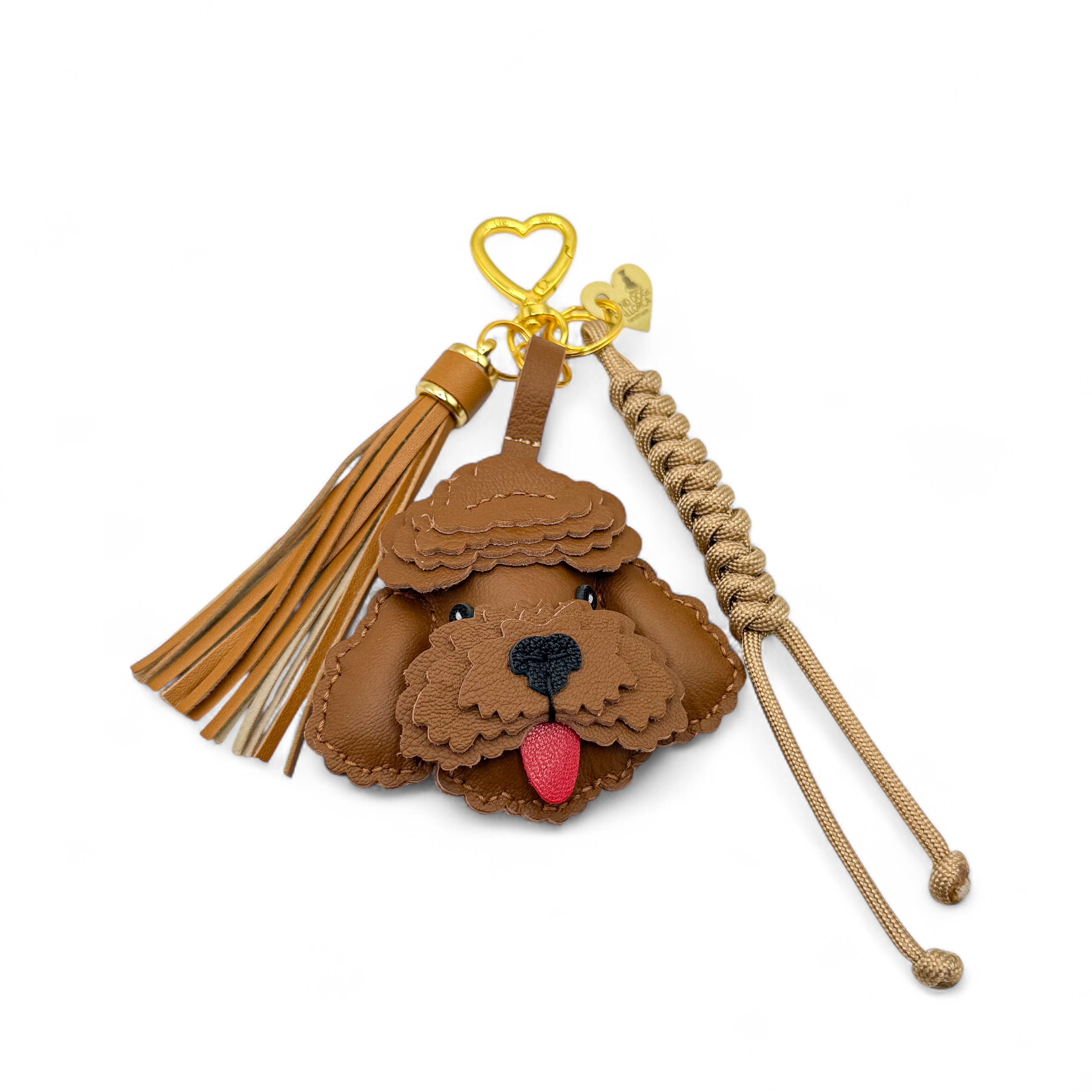 Dieser stylische Taschenanhänger besteht aus einem Doodle/ Poodle Kopf aus Leder in Braun, eine Quaste in Cognac, einem Paracordanhänger in Sandgold und einem Herzkarabiner an dem alle einzelteile befetigt sind.