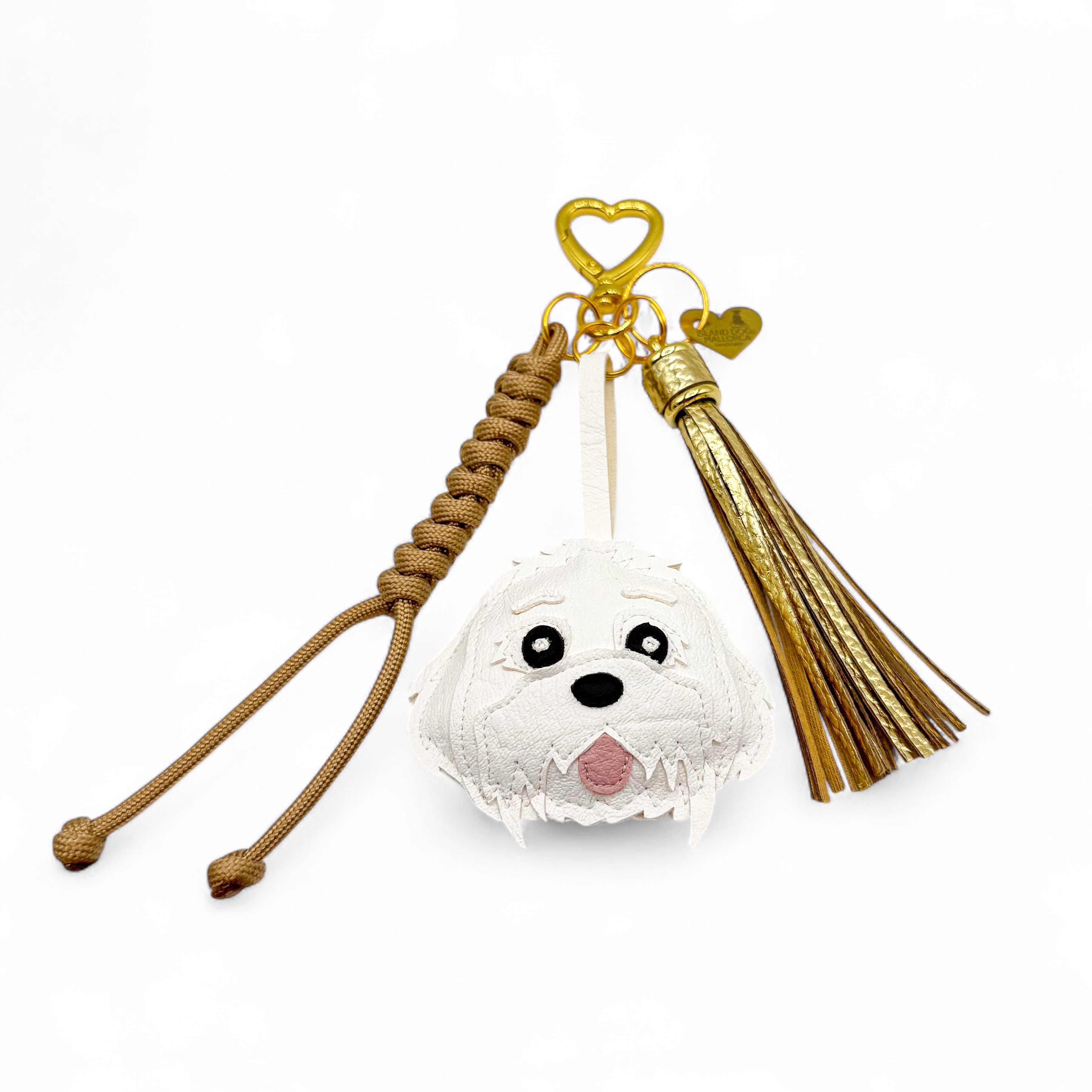 Dieser stylische Taschenanhänger besteht aus einem Malterser Hundekopf aus Leder in Creme, eine Quaste in Gold, einem Paracordanhänger in Sandgold und einem Herzkarabiner an dem alle einzelteile befetigt sind.