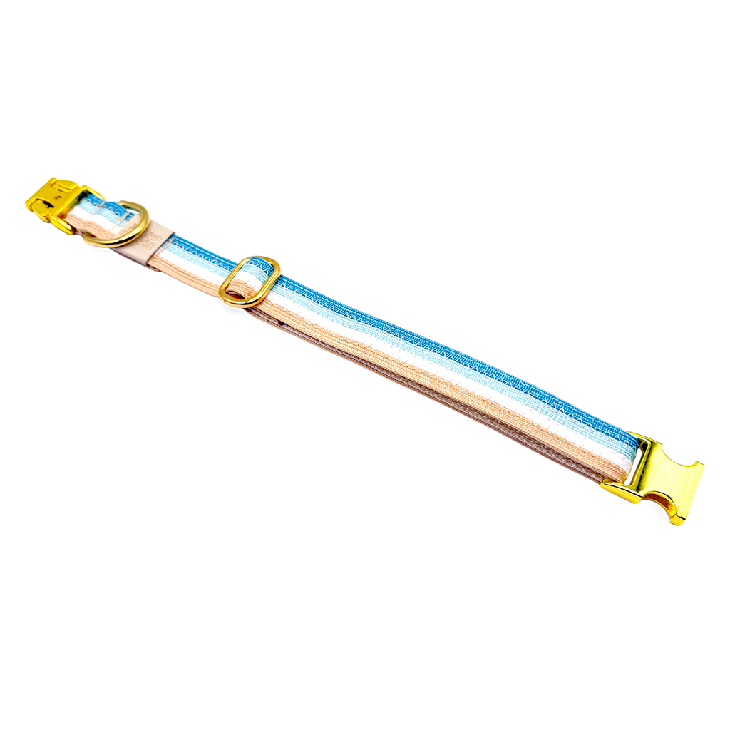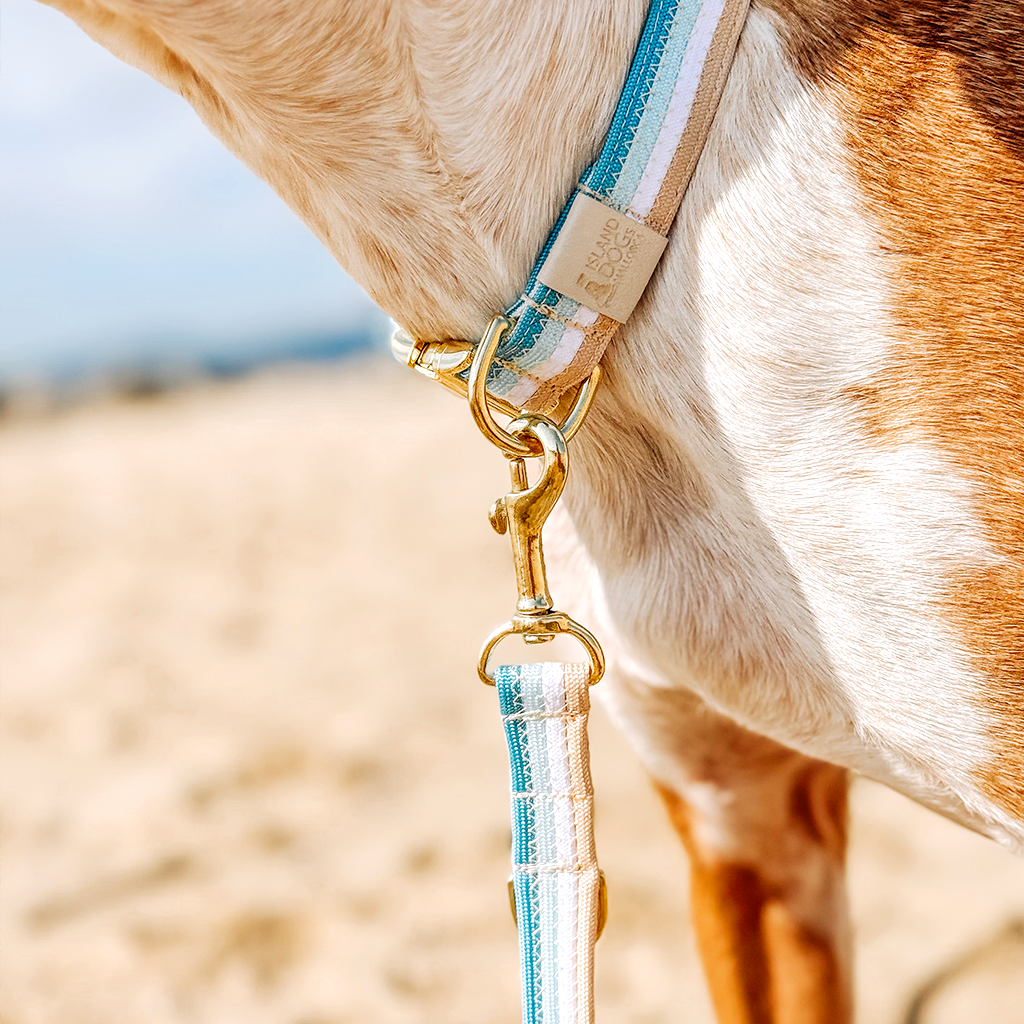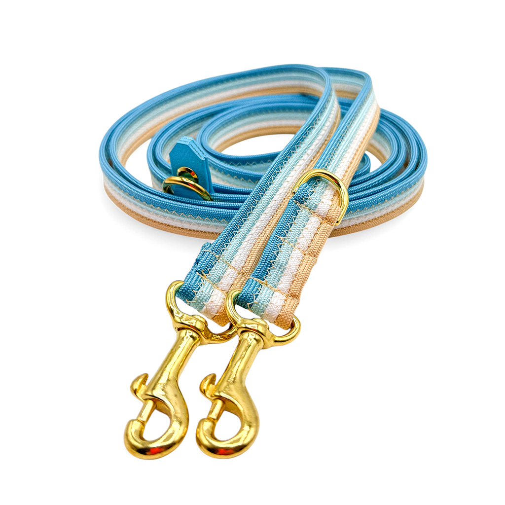 The set in the picture consists of paracord in the colors Tropicana Blue, Candy Blue, Glacier Blue and Carolina Blue. The paracord straps were sewn together with a zigzag seam and the collar was additionally lined and reinforced with webbing. A click fastener was used as a clasp and the collar is infinitely adjustable. The leash in the picture is 2.10m long and is infinitely adjustable along its entire length using the attached slider.
