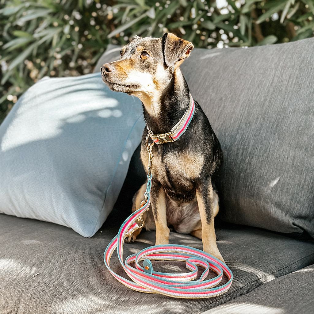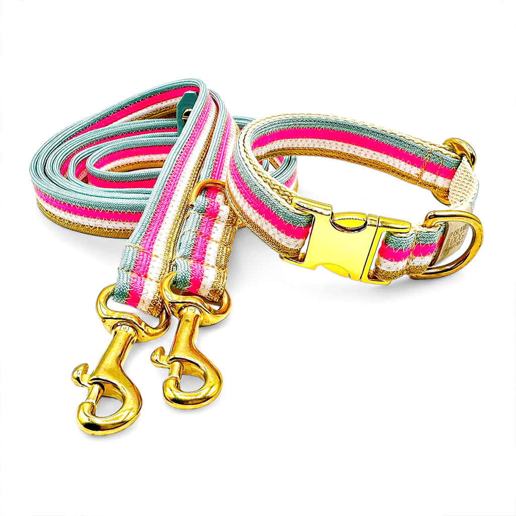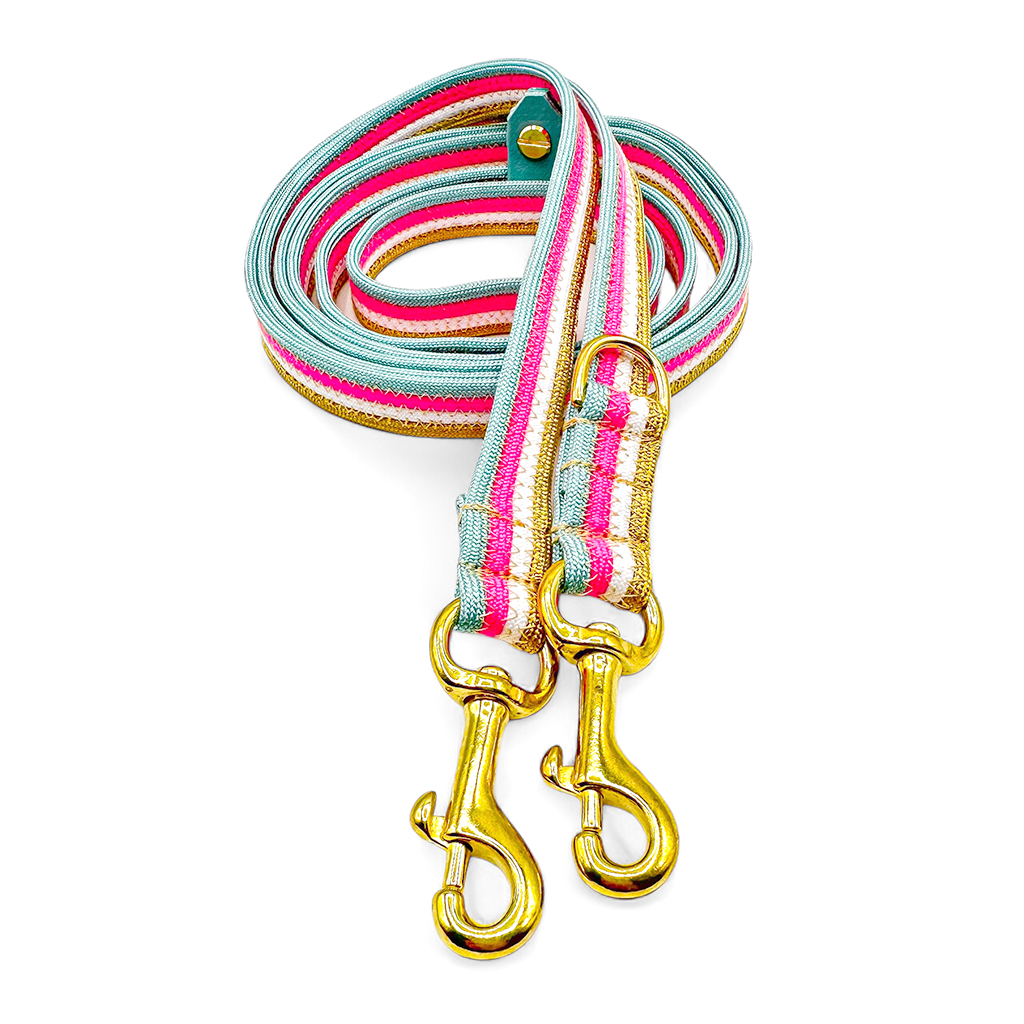 The set pictured consists of paracord in glacier blue, neon pink, white, and gold. The paracord straps are sewn together with a zigzag seam, and the collar is additionally lined and reinforced with webbing. The collar features a snap closure, and it is infinitely adjustable. The leash included in the set is 2.20 m long and is infinitely adjustable along its entire length using the attached slider.