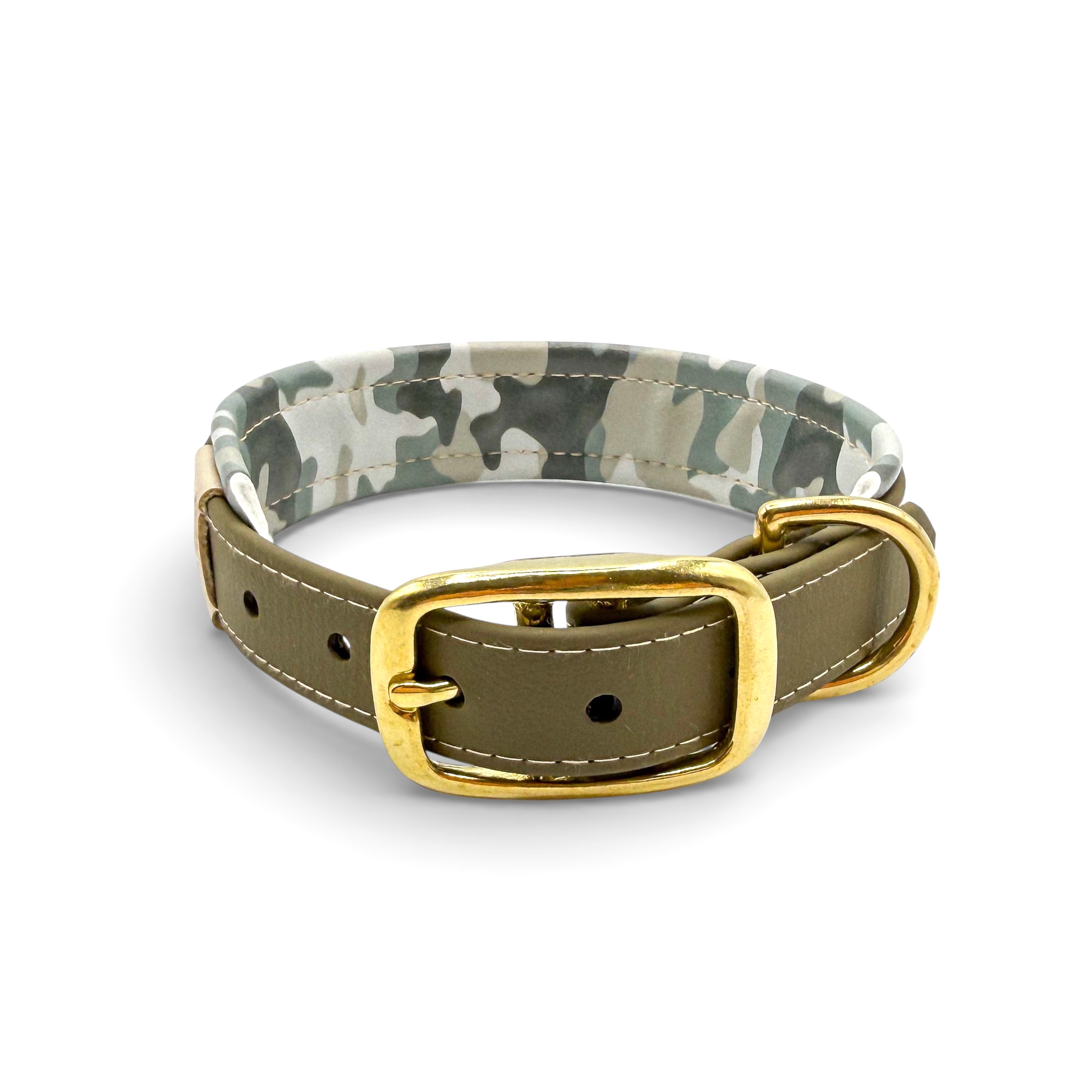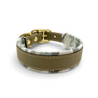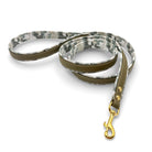 Material: Biothane in der Farbe Olive,  Kunstleder im Camouflage Muster, Beschläge aus Messing