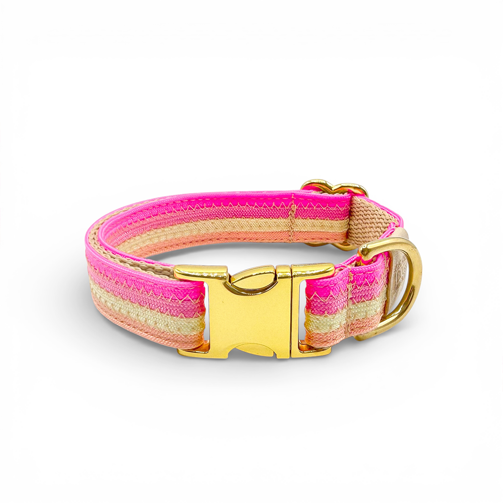 Das Halsband auf dem Bild besteht aus Paracordband in den Farben Neon Pink, Peony, Pastell Gelb, Blood Orange. Die Paracordbänder wurden mit einer Zickzack Naht zusammengenäht und das Halsband zuätzlich mit Gurtband unterlegt und verstärkt. Als Schließe wurde ein Klickverschluss verarbeiten und das Halsband ist stufenlos verstellbar.