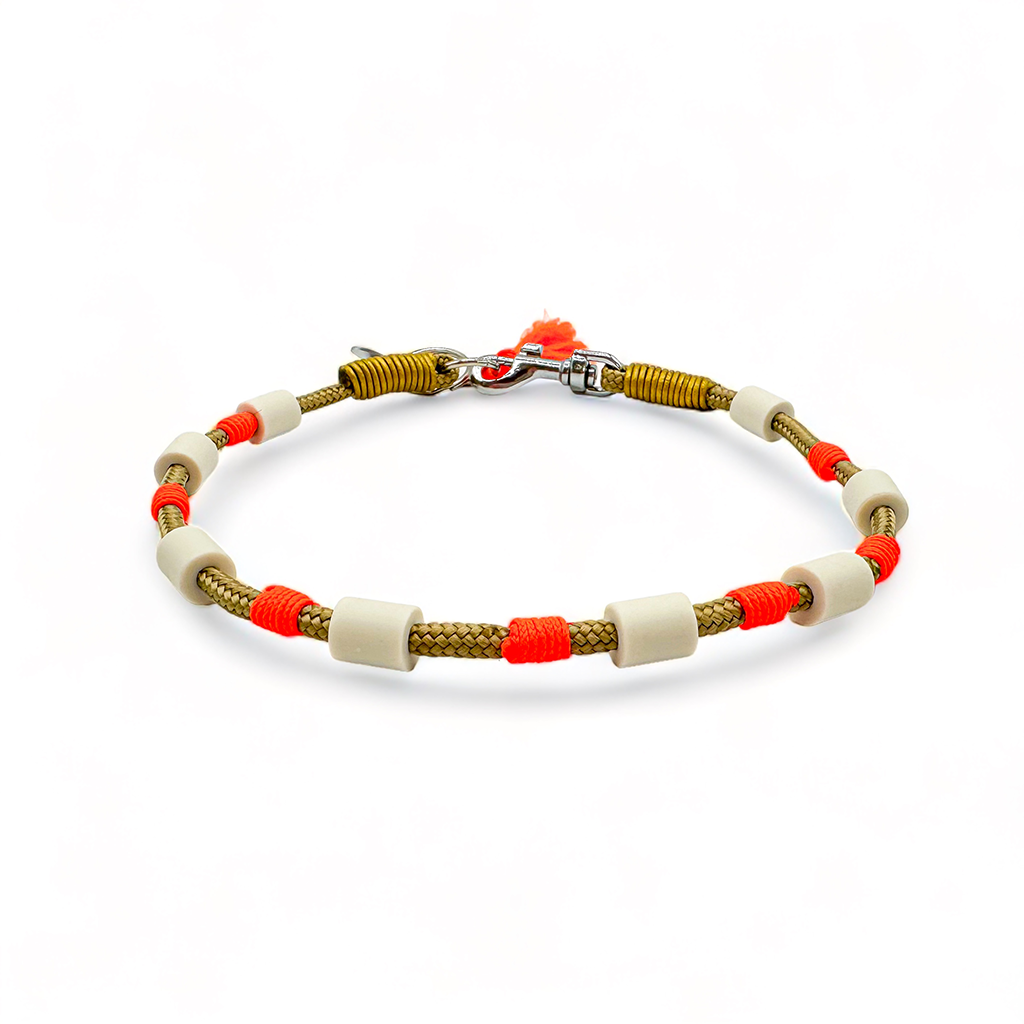 Color & Material: PPM rope in golden brown, paracord cord in neon orange and leather cord in gold