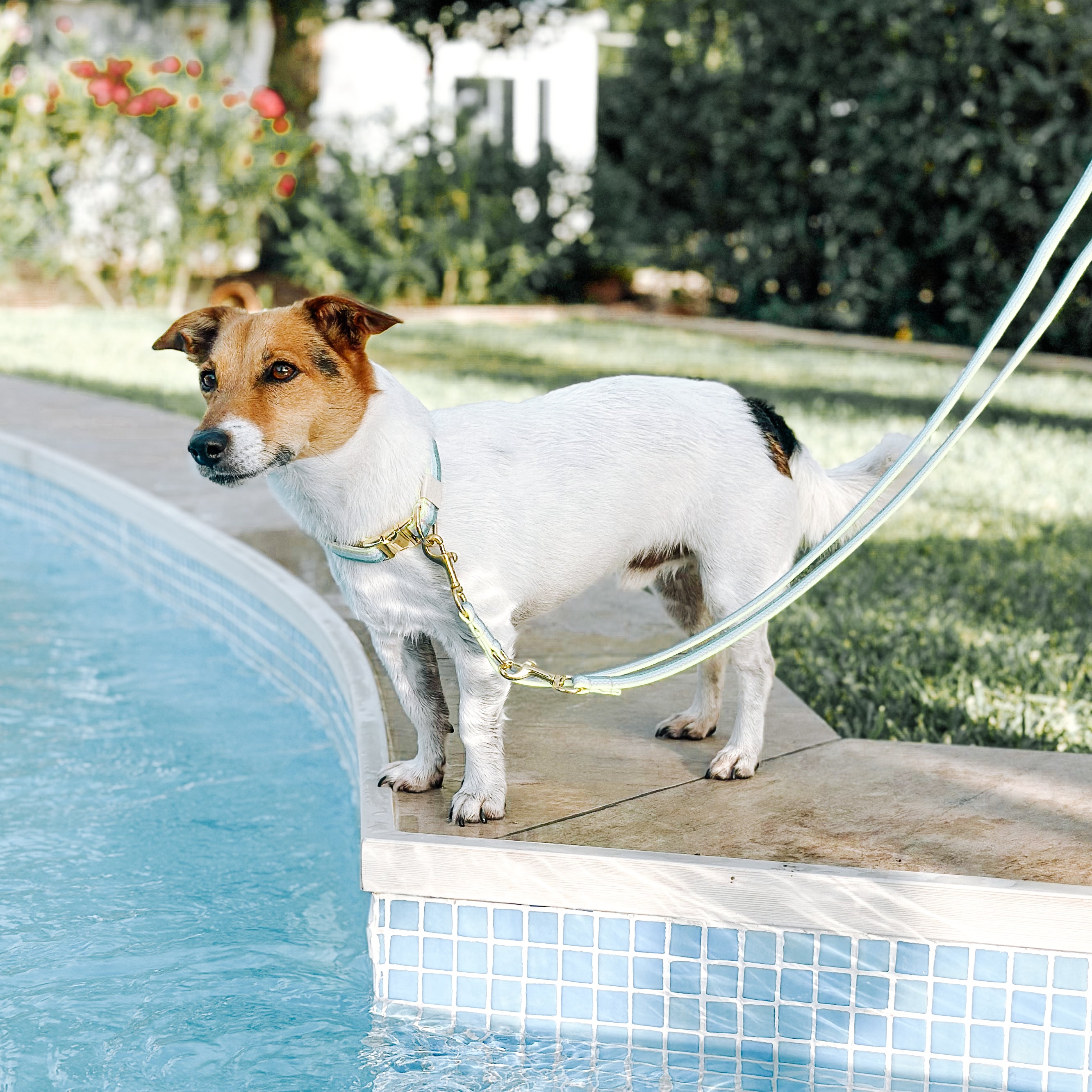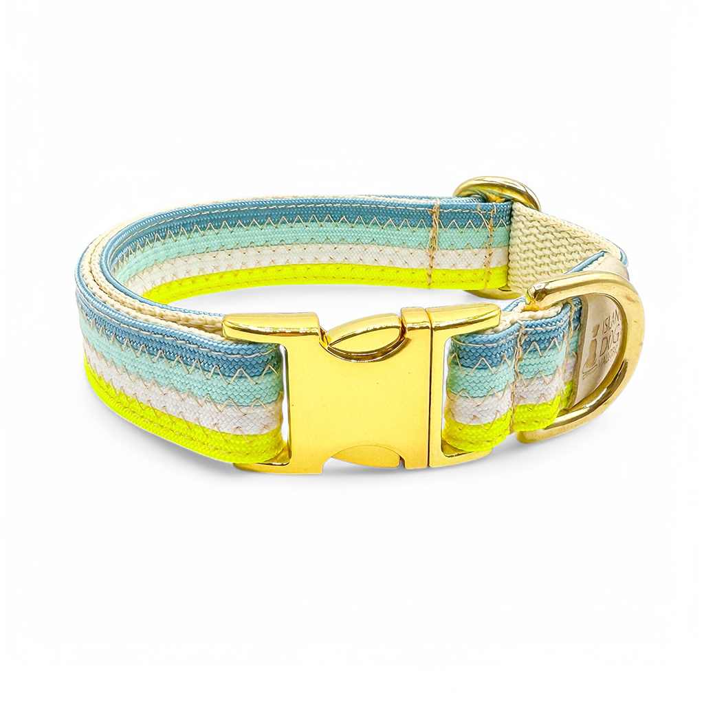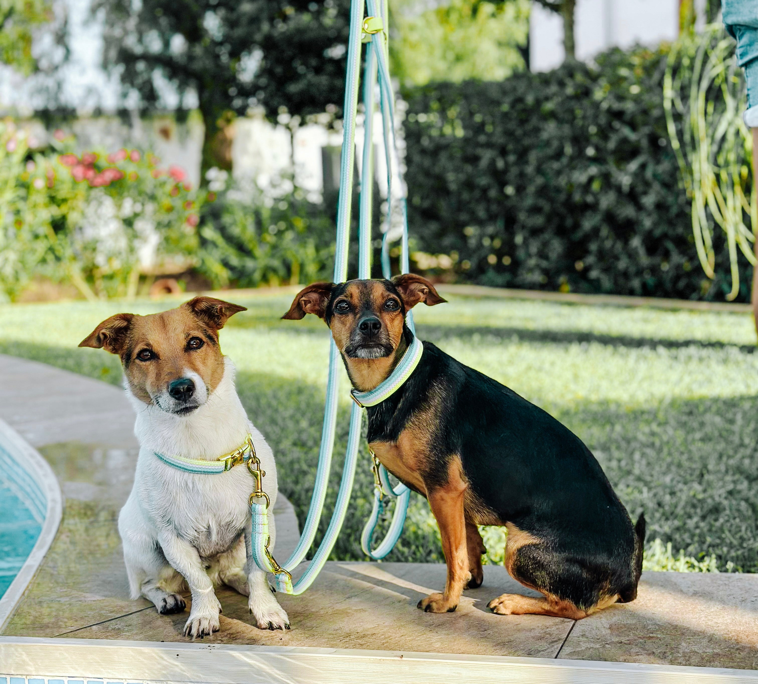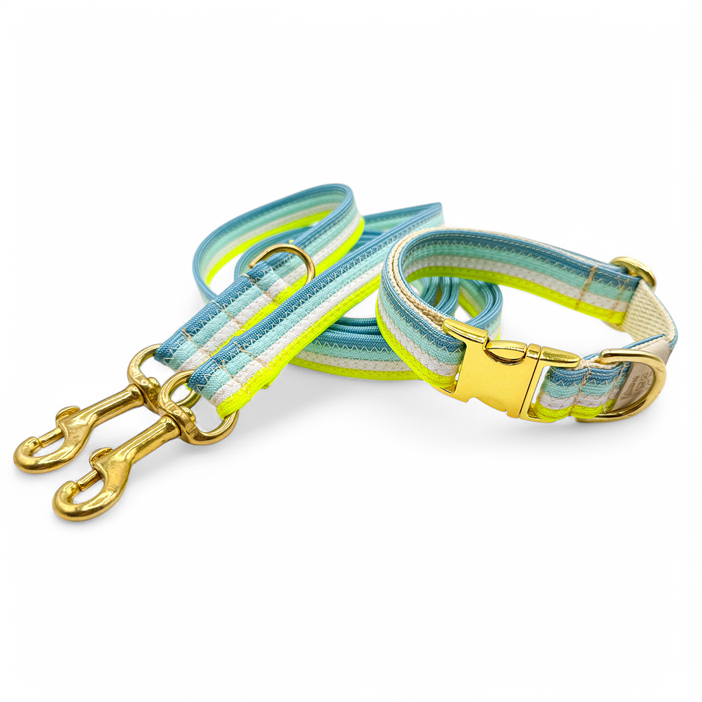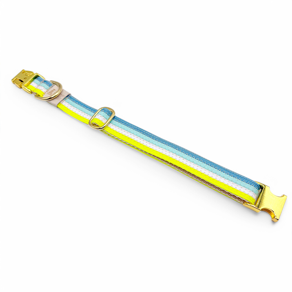 El conjunto de la imagen se compone de paracord en los colores azul California, azul Tropicana, amarillo neón y blanco. Las correas de paracord estaban cosidas entre sí con una costura en zigzag y el cuello estaba además forrado y reforzado con cintas. El cierre es de clic y el collar es infinitamente ajustable. La correa del conjunto tiene una longitud de 2,10 m y es ajustable de forma continua a lo largo de toda su longitud mediante el deslizador adjunto.