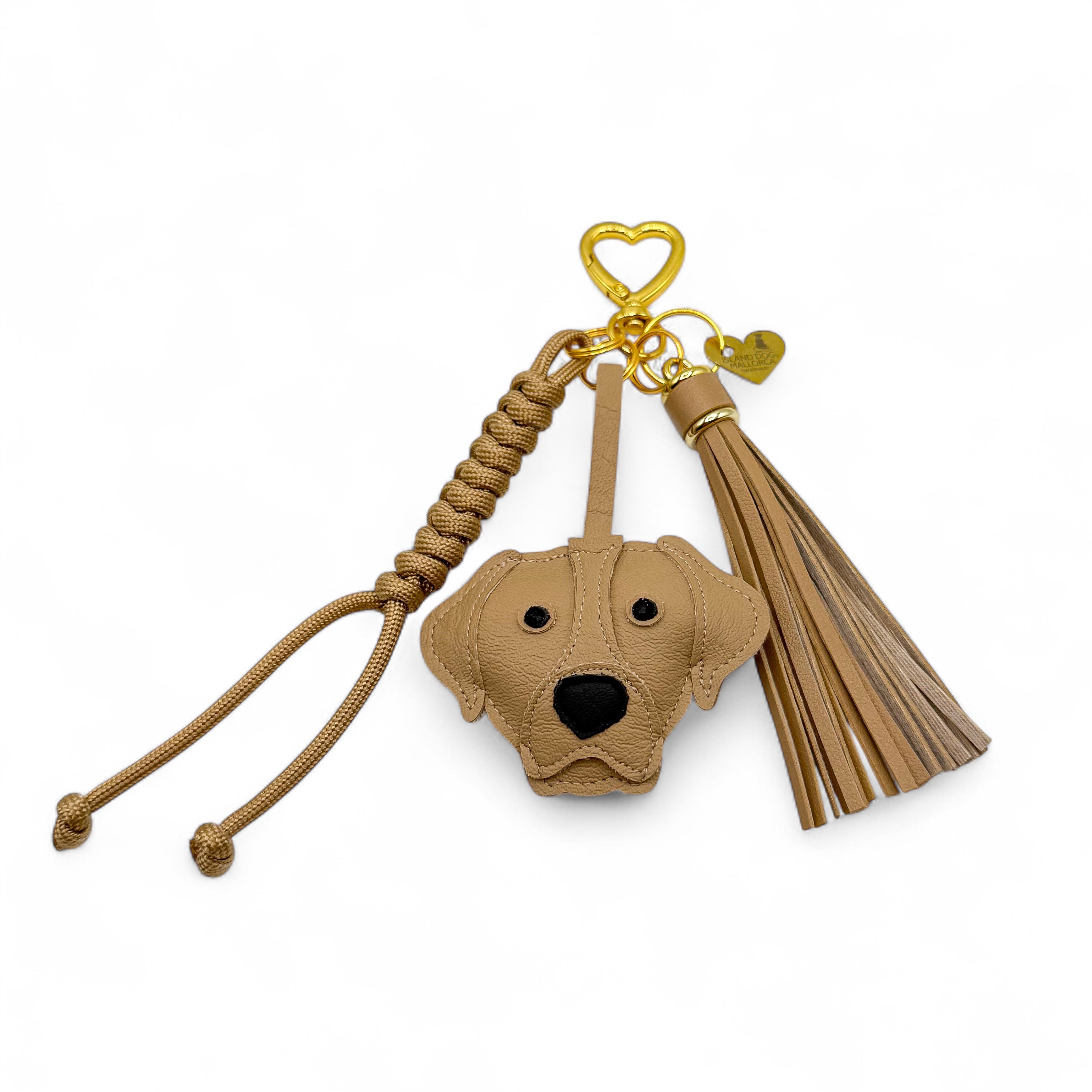 Este elegante dije para bolso consta de una cabeza de perro labrador de color marrón chocolate, una borla beige, un dije de paracord beige y un mosquetón con forma de corazón al que se unen todas las piezas individuales.