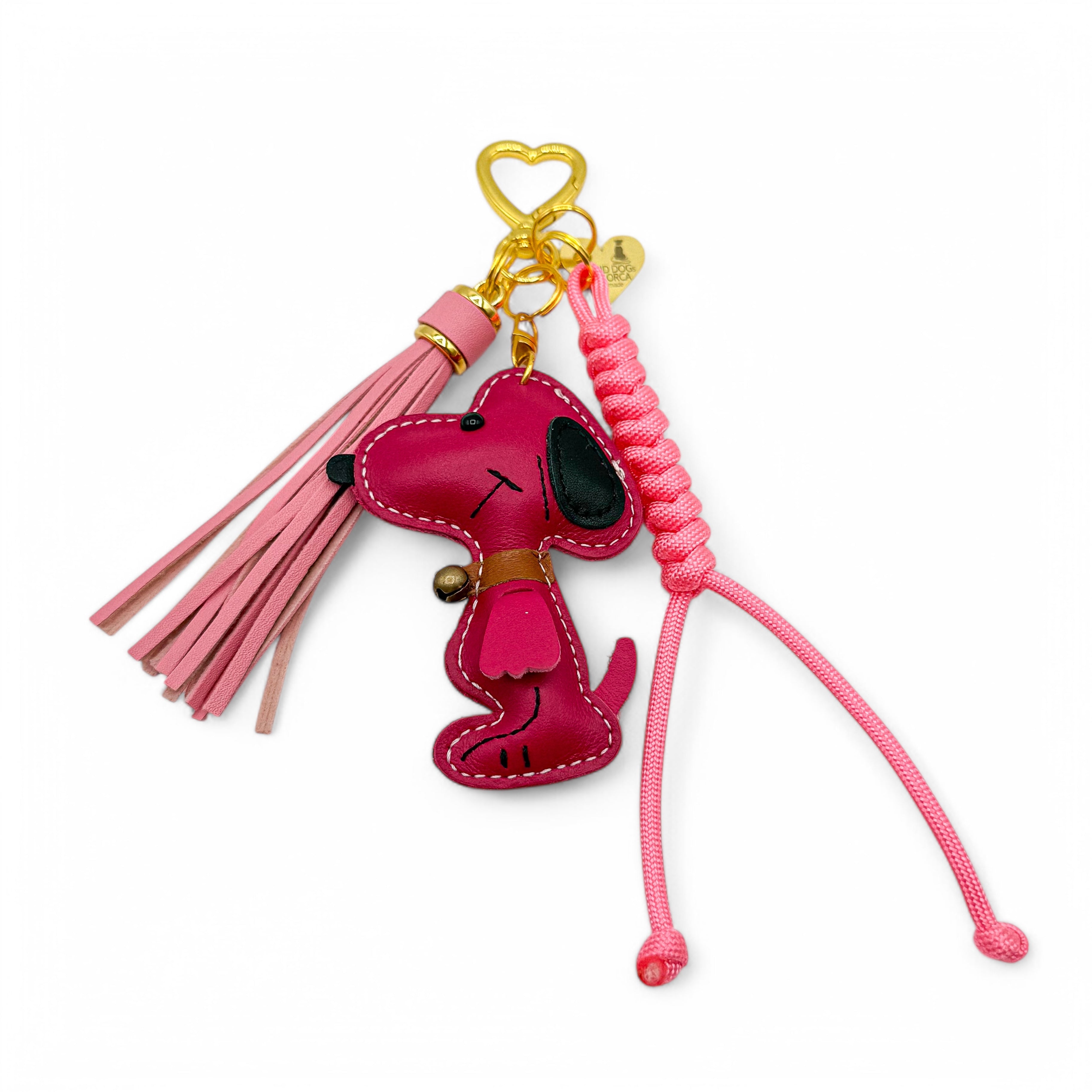 Este elegante dije para bolso consta de un Snoopy en cuero color baya, una borla en color rosa, un dije de paracord en color rosa melocotón y un mosquetón en forma de corazón al que se unen todas las piezas individuales.