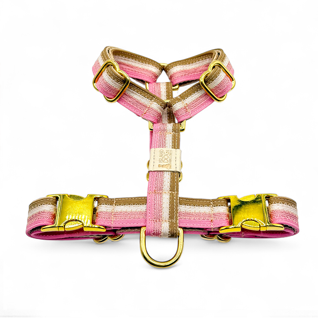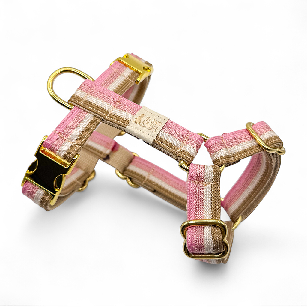 El arnés de la imagen está hecho de paracord en los colores Army Green, Guacamole, Mojito y Glacier Blue. Las correas de paracord se cosieron en zigzag y el collar se reforzó con cincha. El cierre se realizó con dos cierres de clic, y el arnés se ajusta de forma continua en la zona abdominal, el pecho y la correa inferior.
