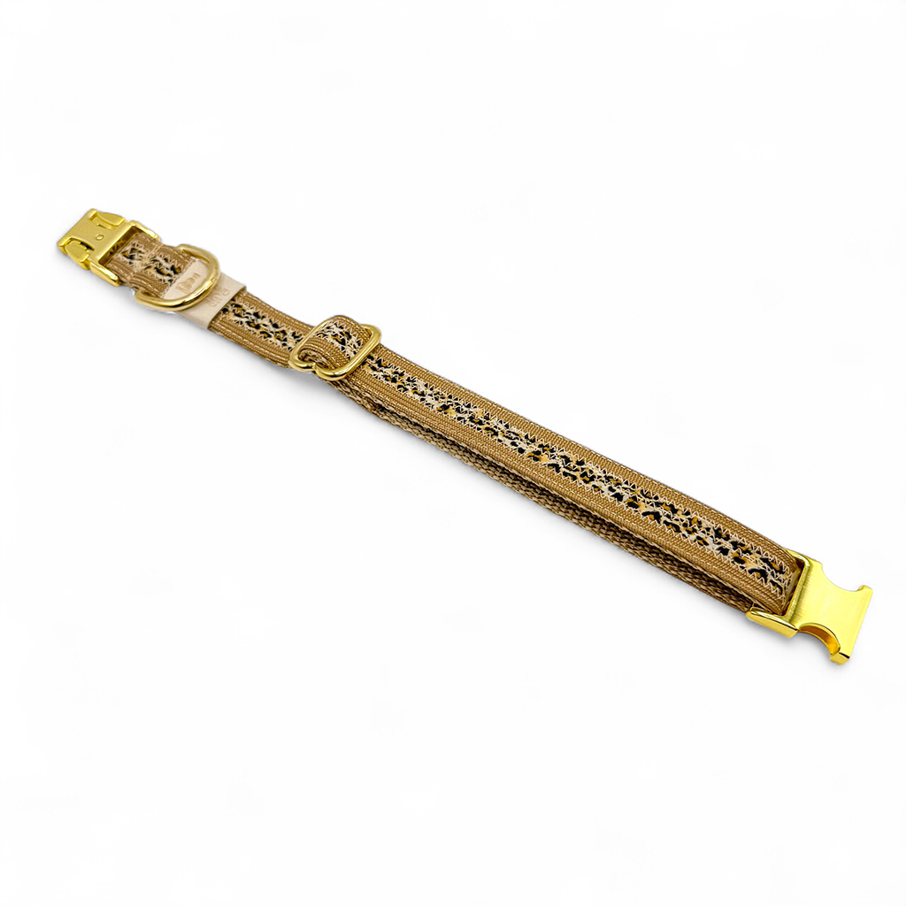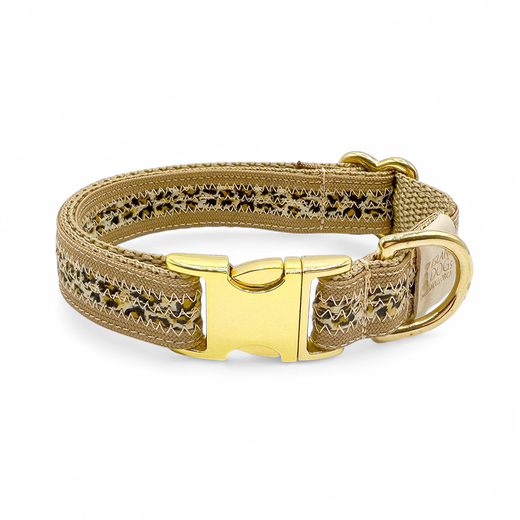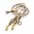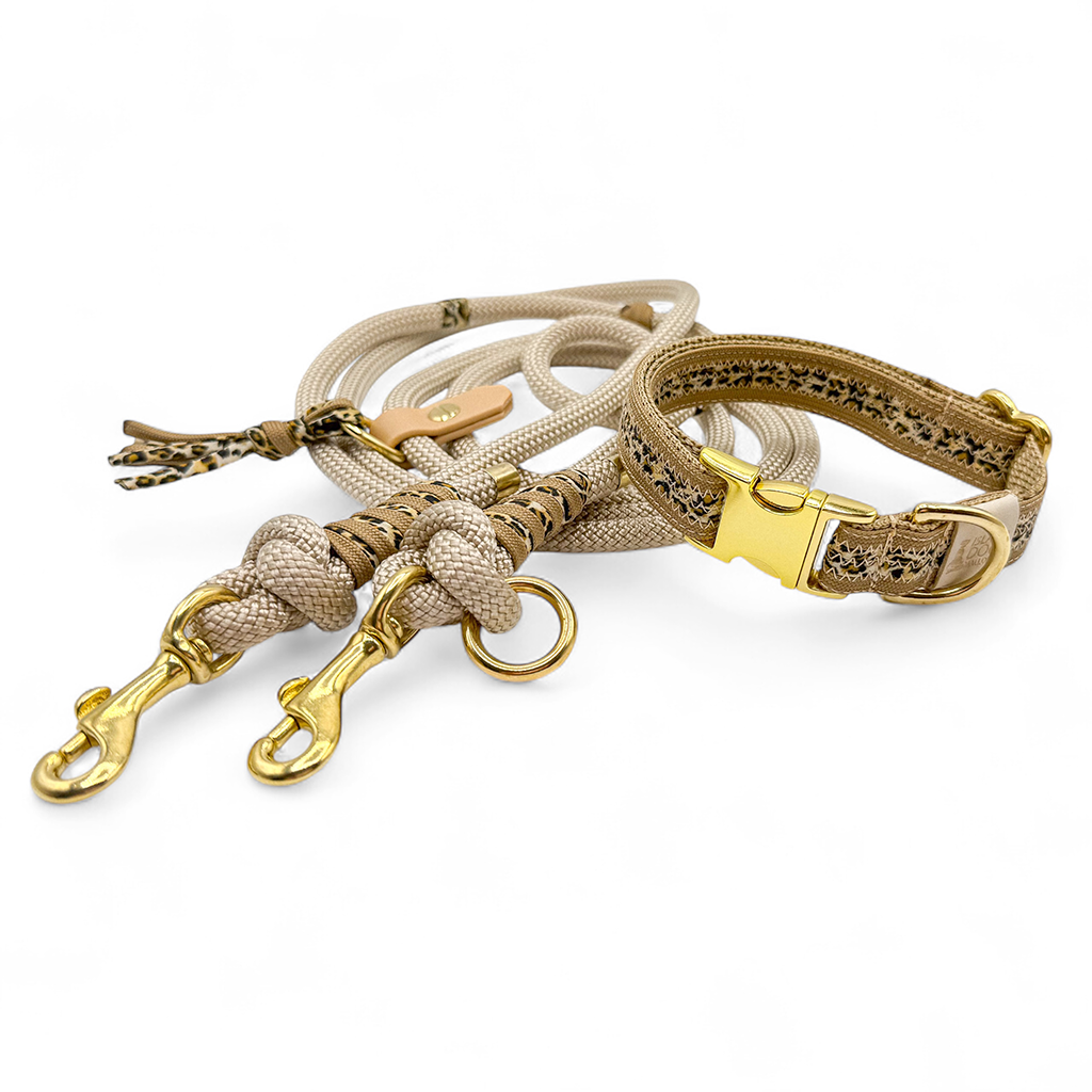 El conjunto de la imagen consta de paracord color marrón sahariano y cordón de algodón con estampado de leopardo. Las correas de paracord están cosidas en zigzag, y el collar está forrado y reforzado con cincha. El collar tiene cierre a presión y es ajustable sin escalonamientos. La correa de este conjunto es de cuerda y solo está disponible a juego. Mide 2,10 m y es ajustable sin escalonamientos en toda su longitud.