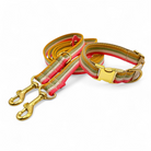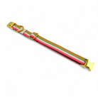 El conjunto de la imagen consta de paracord en colores caramelo, guacamole, crema y rosa cereza. Las correas de paracord están cosidas en zigzag, y el collar está forrado y reforzado con cincha. El collar tiene un cierre a presión y es ajustable sin escalonamientos. La correa incluida mide 2,20 m de largo y se ajusta sin escalonamientos en toda su longitud mediante el deslizador incluido.