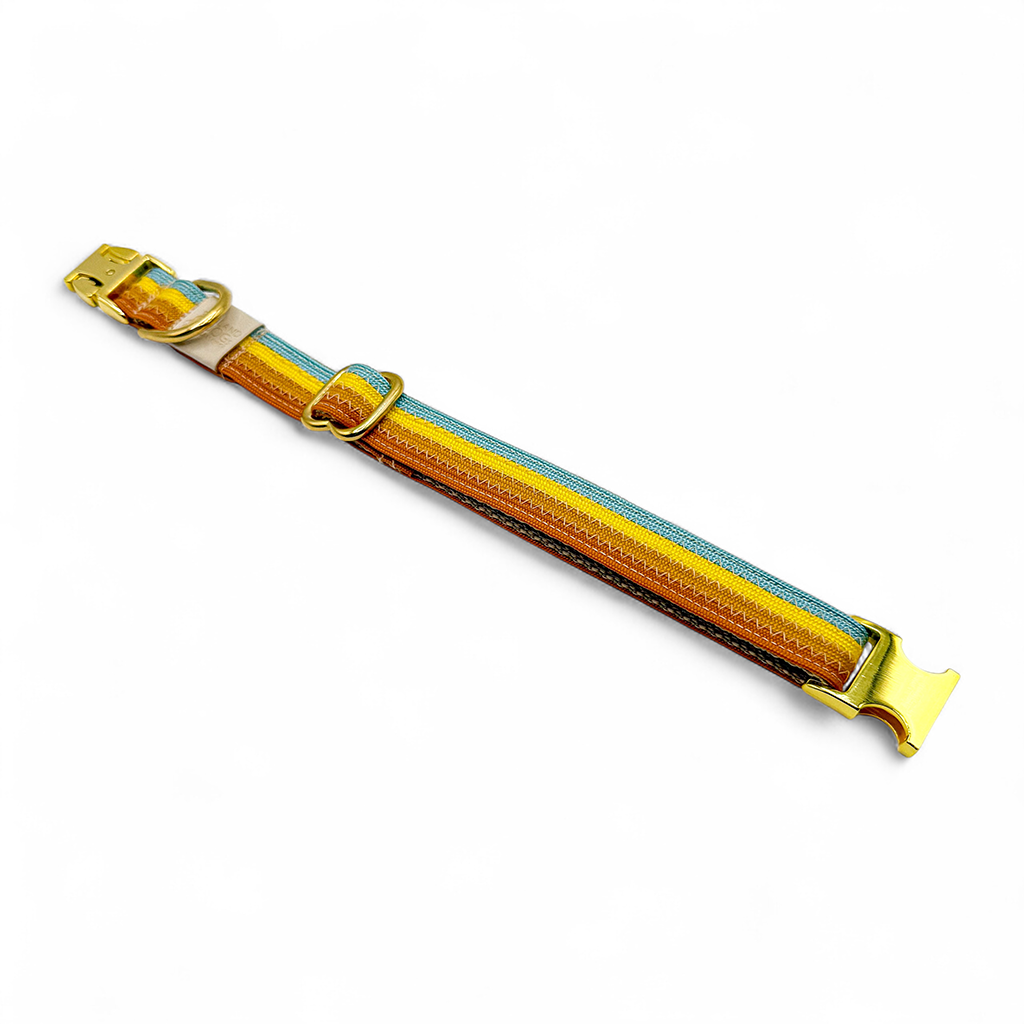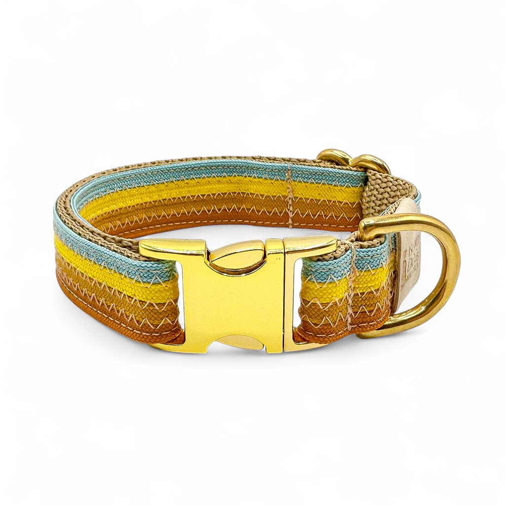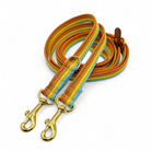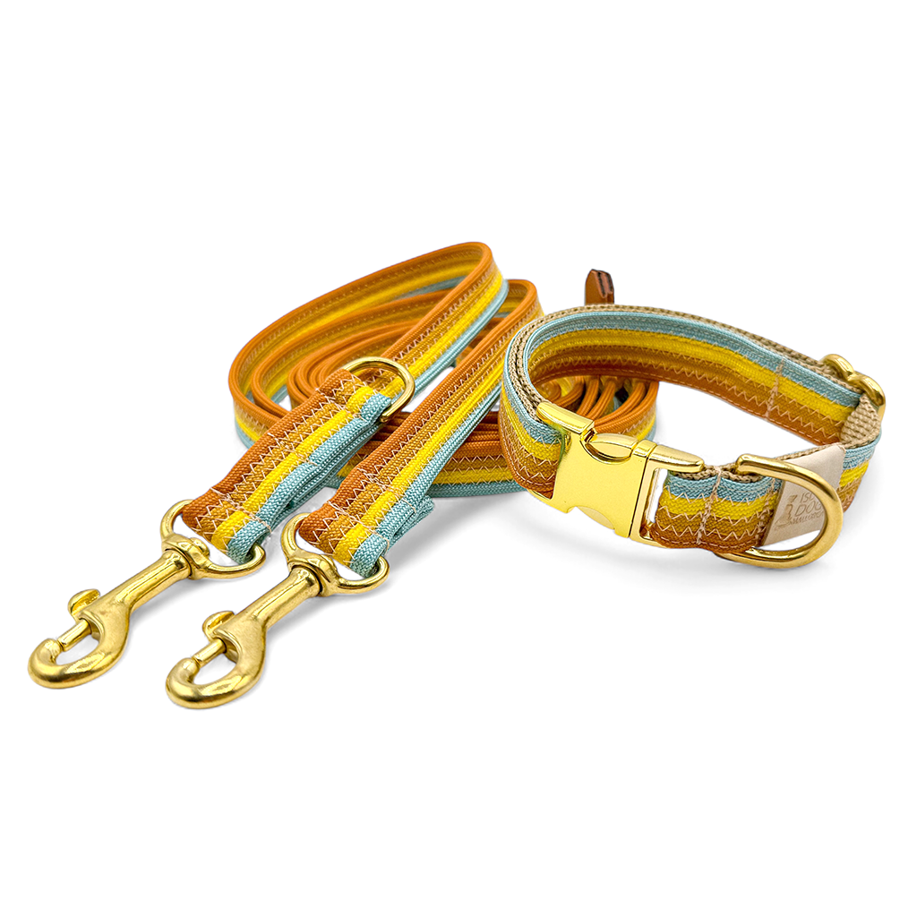 El conjunto de la imagen consta de paracord en azul glaciar, amarillo limón, caramelo y mostaza. Las correas de paracord están cosidas en zigzag, y el collar está forrado y reforzado con cincha. El collar tiene un cierre a presión y es ajustable sin escalonamientos. La correa incluida mide 2,20 m de largo y se ajusta sin escalonamientos en toda su longitud mediante el deslizador incluido.