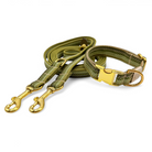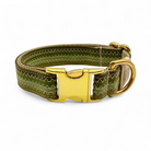 El conjunto de la imagen consta de paracord en verde militar, gucamole, musgo y pimiento verde. Las correas de paracord están cosidas con puntada en zigzag, y el collar está forrado y reforzado con cincha. El collar tiene un cierre a presión y es ajustable sin escalonamientos. La correa incluida en el conjunto mide 2,20 m de largo y se ajusta sin escalonamientos en toda su longitud mediante el deslizador incluido.