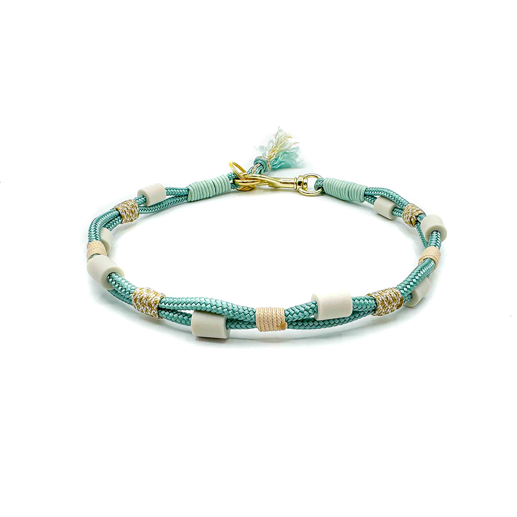 Farbe & Material: PPM Tau in der Farbe Sea Green, Paracordtakelung in Golden Diamonds, Türkies & Lederband in Mint.
