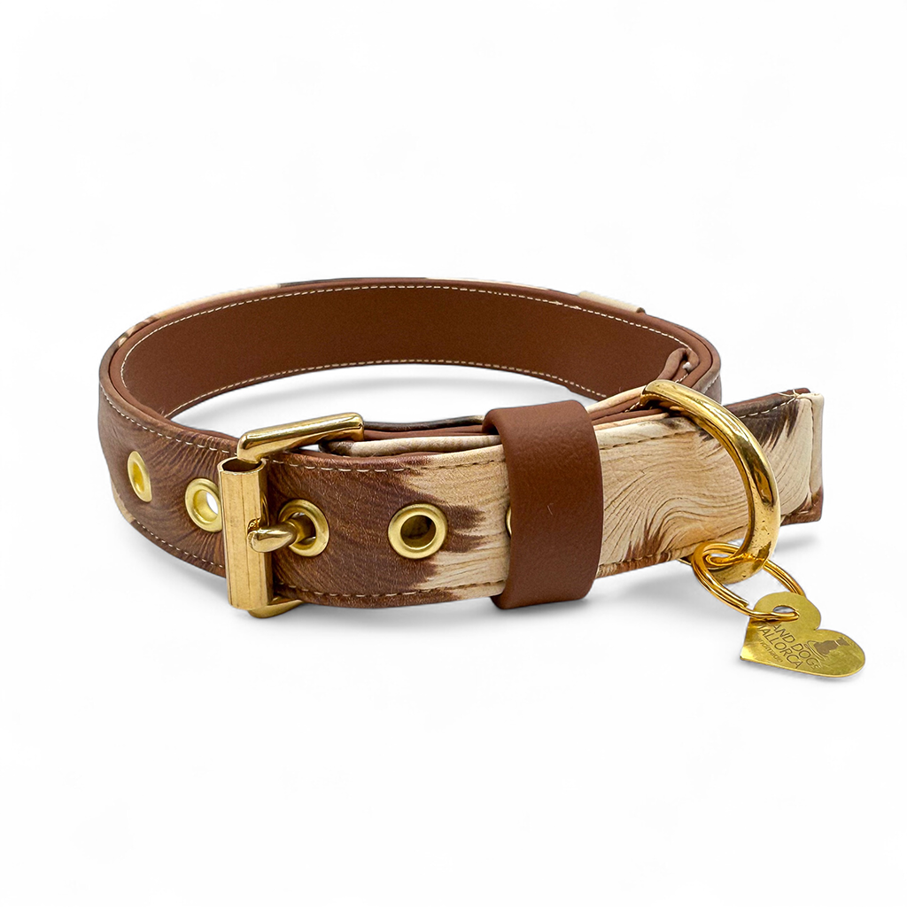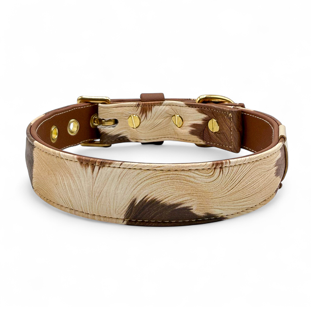 Dieses Halsband besteht aus Biothane und auf der Oberseite wurde Kunstleder/Kunstfell in verschiedenen Mustern aufgenäht. Es ist mehrfach verstellbar und mit einer Rollschnalle versehen, sowie mit goldenen Ösen in den Löchern zum verstellen. Eine passende Leine kann sich in unserem Deluxe Leine Konfigurator konfiguriert werden.