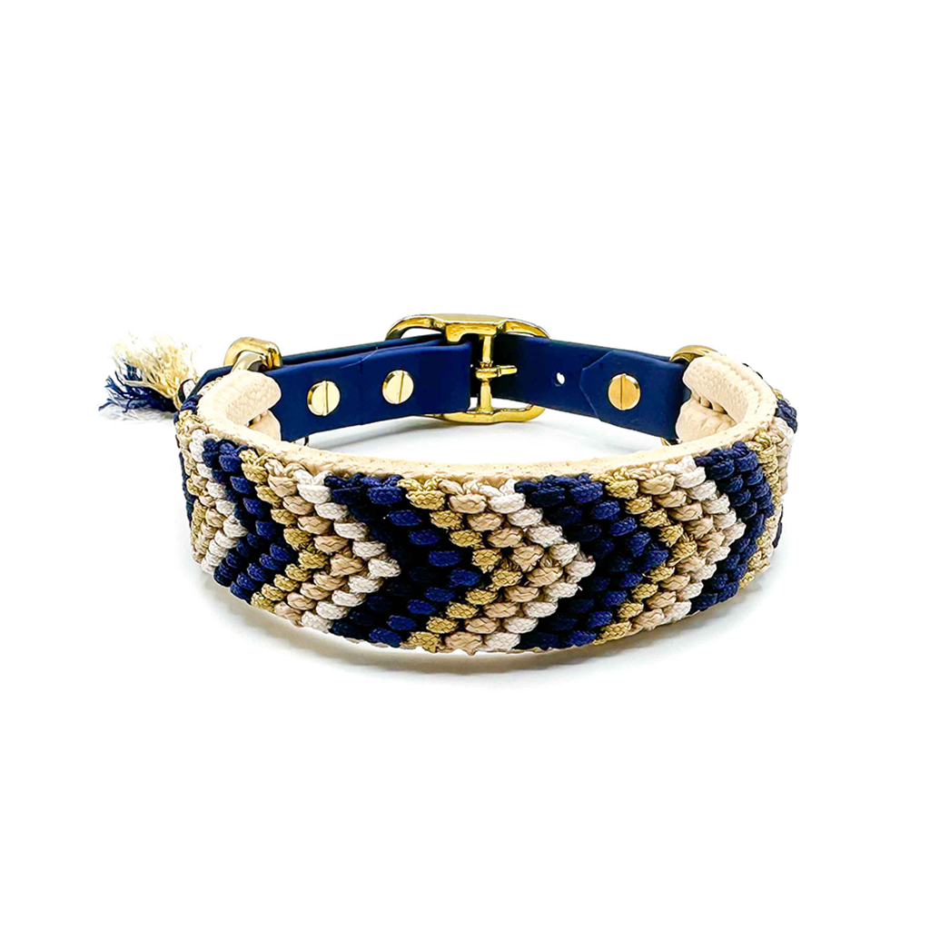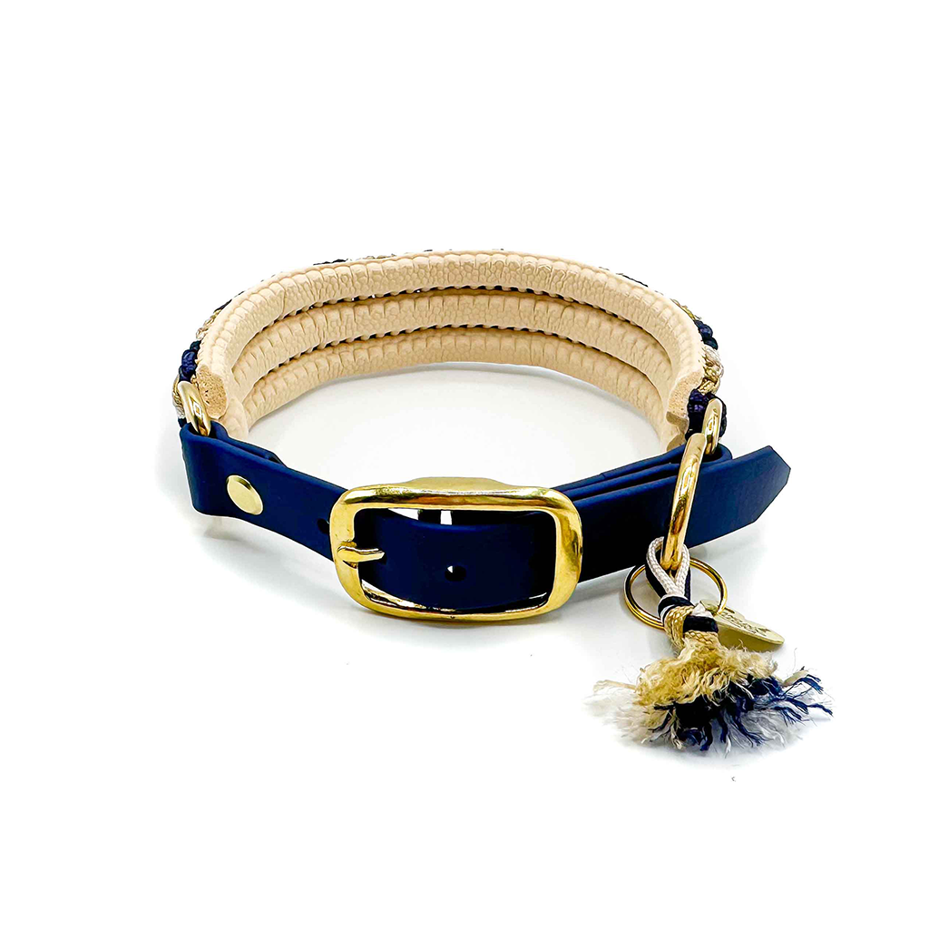 Das Halsband auf dem Bild hat eine Breite von 3 cm und besteht aus hangeknüpften Paracordbandmuster in Pfeiloptik. Insgesamt wurden hier die 5 Farben Carribean Blue, Türkies, Pastell Blau, Sea Grün und Sahne verarbeitet. Zusätzlich wurde das Halsband mit einer super weichen Polsterung in der Farbe Cream unterlegt und bietet so einen super angenehm Tragekomfort. Wenn du eine Leine wählst, passen wir diese farblich dem Halsband an und die Optik der Leine ist wie die unserer Tau Designs.