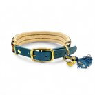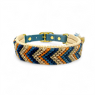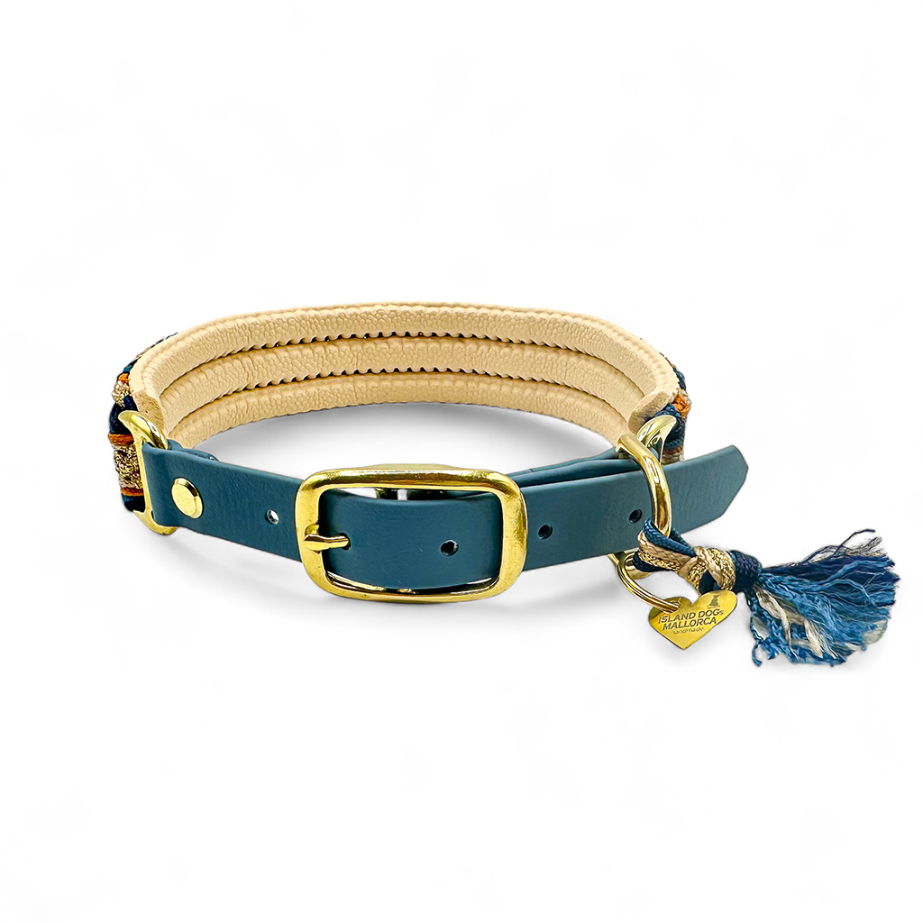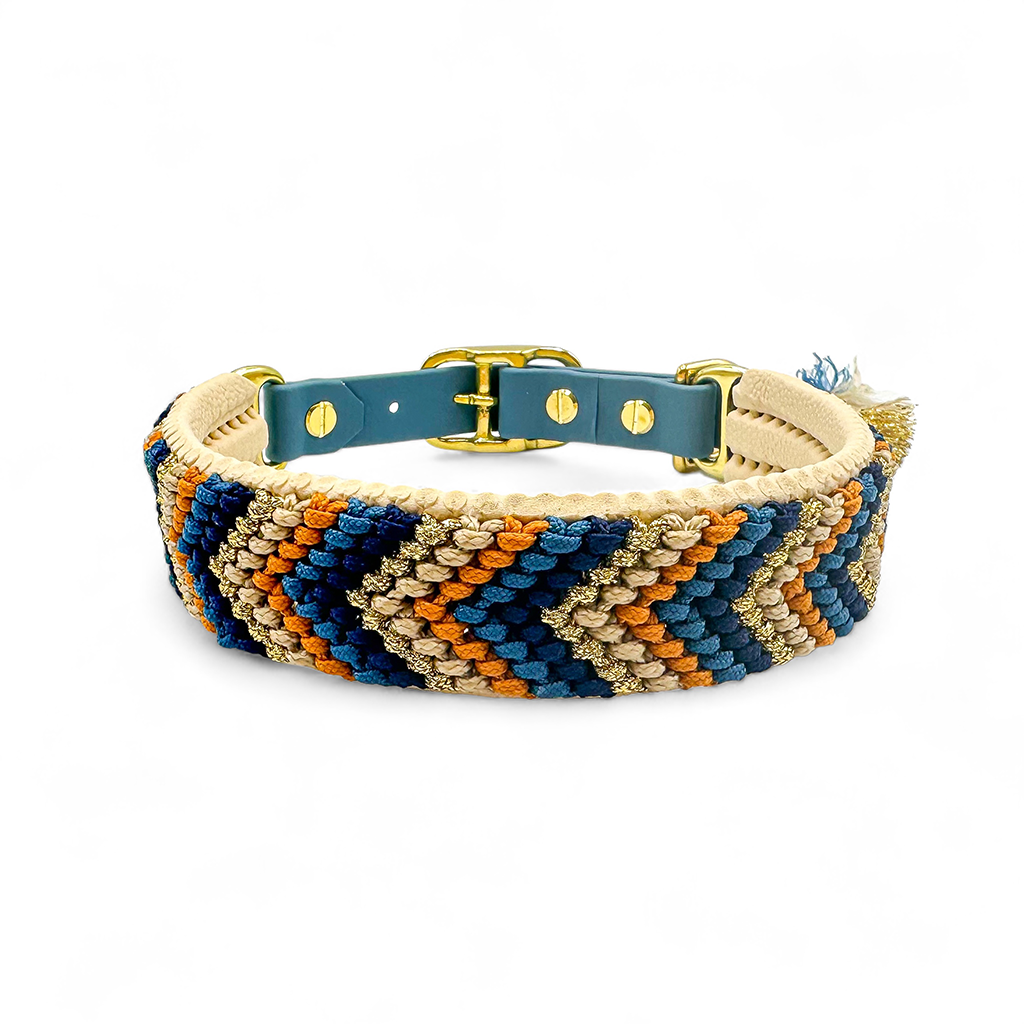 Das Halsband auf dem Bild hat eine Breite von 3 cm und besteht aus hangeknüpften Paracordbandmuster in Pfeiloptik. Insgesamt wurden hier die 5 Farben Dunkelblau, Petrol Blau, Beige, Karamell und Glitzer Gold verarbeitet. Zusätzlich wurde das Halsband mit einer super weichen Polsterung in der Farbe Cream unterlegt und bietet so einen super angenehm Tragekomfort. Wenn du eine Leine wählst, passen wir diese farblich dem Halsband an und die Optik der Leine ist wie die unserer Tau Designs.