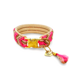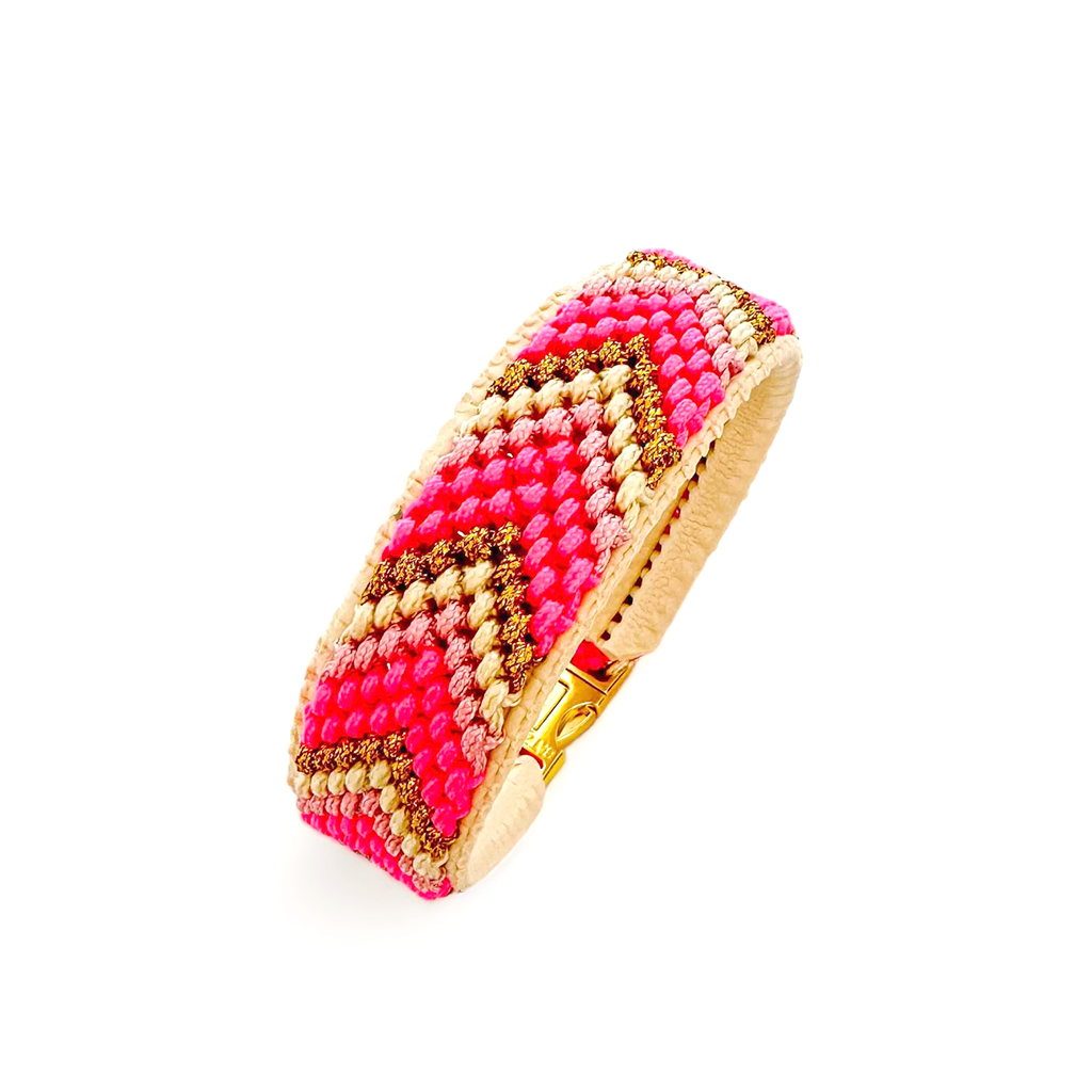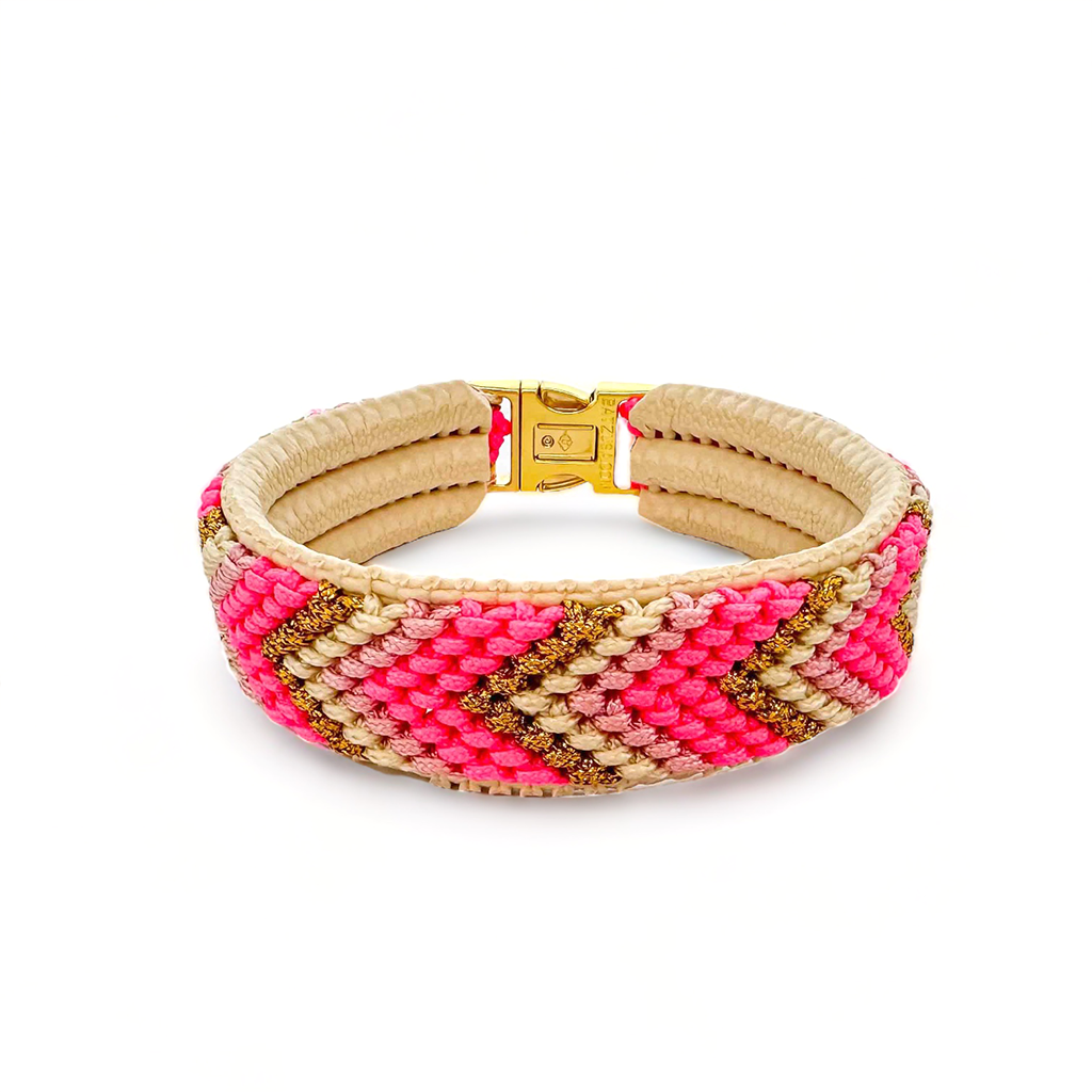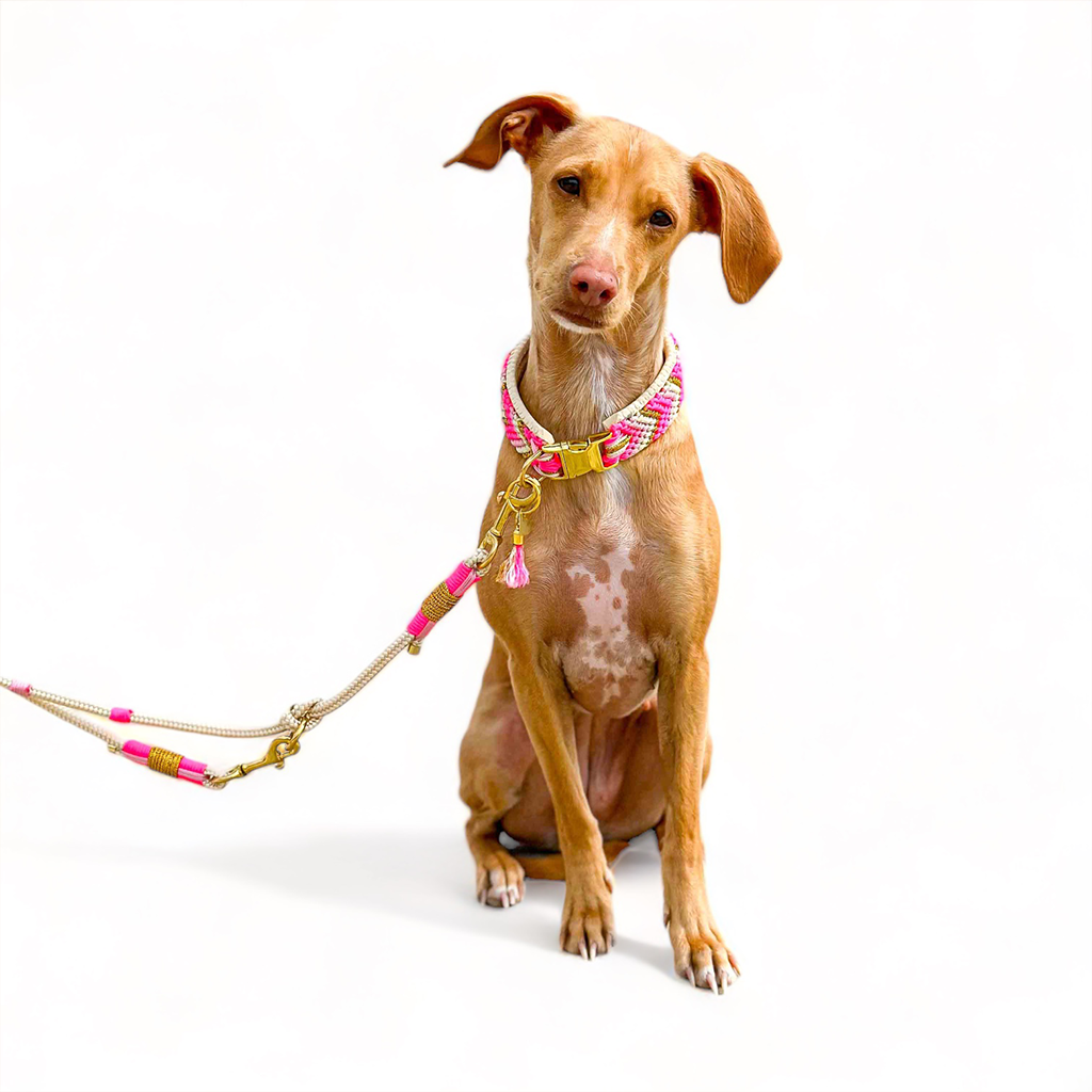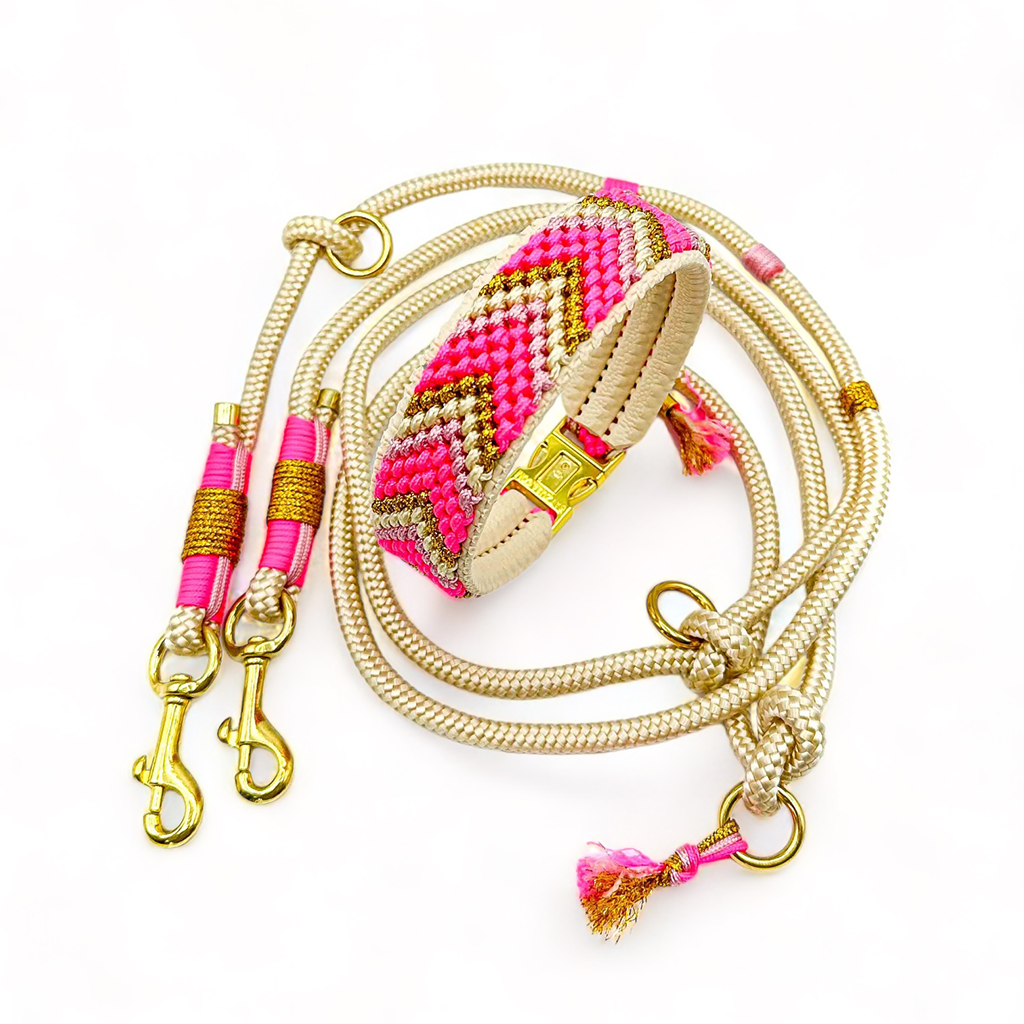 Das Halsband auf dem Bild hat eine Breite von 3 cm und besteht aus hangeknüpften Paracordbandmuster in Pfeiloptik. Insgesamt wurden hier die 3 Farben Neon Pink, Pastell Rosa, Shiny Gold und Glitzer Gold verarbeitet. Zusätzlich wurde das Halsband mit einer super weichen Polsterung in der Farbe Cream unterlegt und bietet so einen super angenehm Tragekomfort. Wenn du eine Leine wählst, passen wir diese farblich dem Halsband an und die Optik der Leine ist wie die unserer Tau Designs.