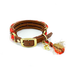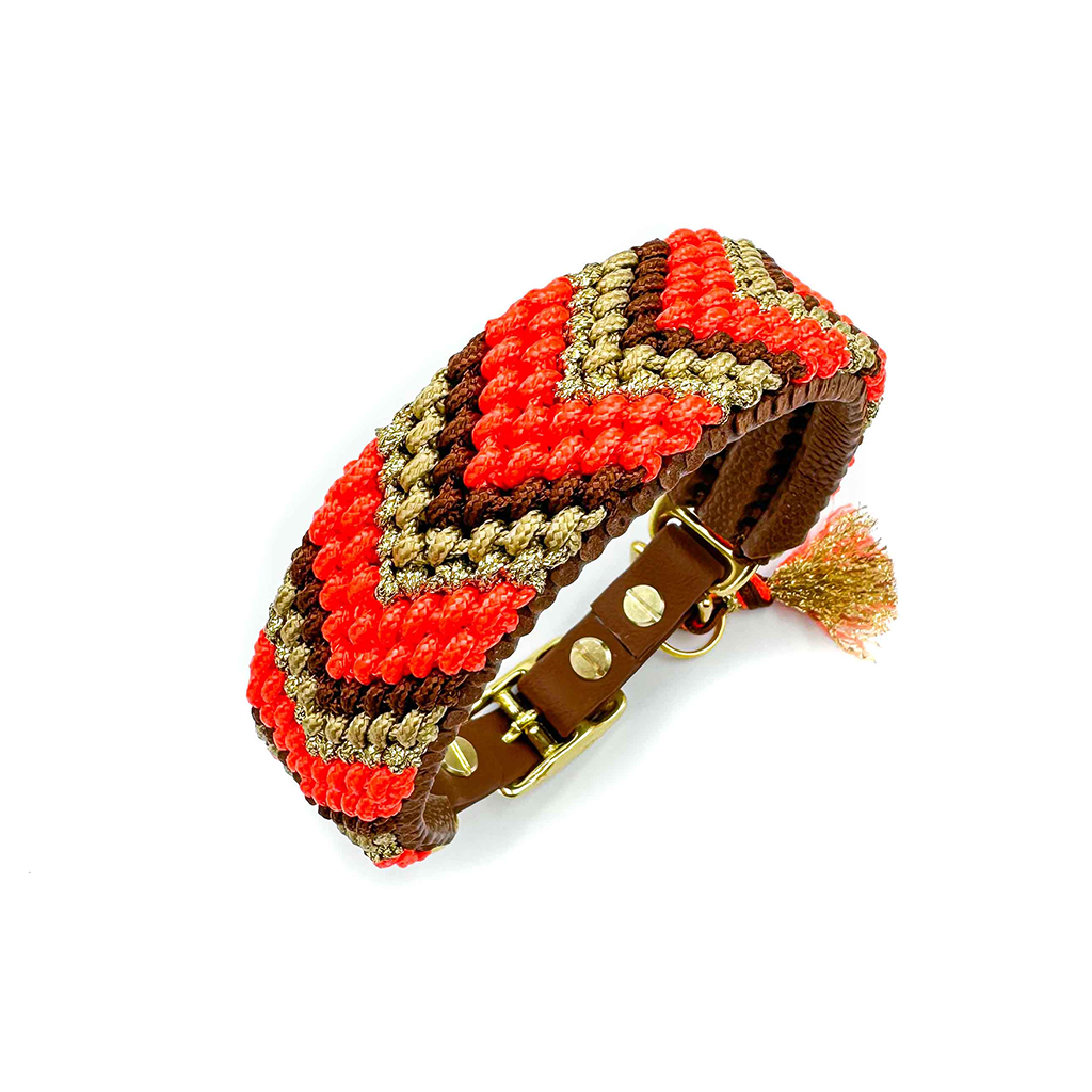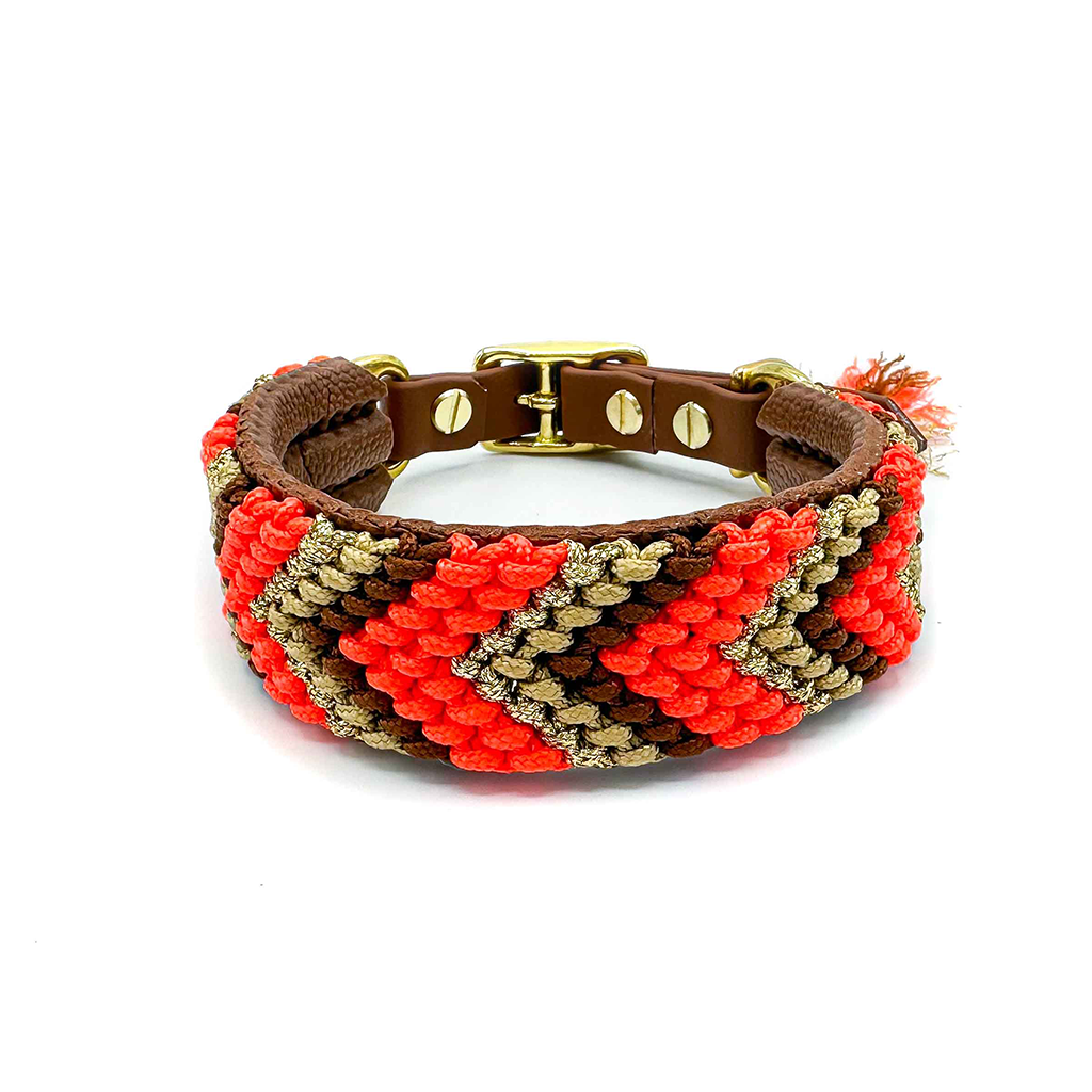 Das Halsband auf dem Bild hat eine Breite von 3 cm und besteht aus hangeknüpften Paracordbandmuster in Pfeiloptik. Insgesamt wurden hier die 4 Farben Chocolate Braun, Gold, Neon Orange und Gold Glitzer verarbeitet. Zusätzlich wurde das Halsband mit einer super weichen Polsterung in der Farbe Cream unterlegt und bietet so einen super angenehm Tragekomfort. Wenn du eine Leine wählst, passen wir diese farblich dem Halsband an und die Optik der Leine ist wie die unserer Tau Designs.