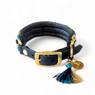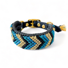 Das Halsband auf dem Bild hat eine Breite von 3 cm und besteht aus hangeknüpften Paracordbandmuster in Pfeiloptik. Insgesamt wurden hier die 4 Farben Petrol, Carribean Blue, Schwarz und Glitzer Gold verarbeitet. Zusätzlich wurde das Halsband mit einer super weichen Polsterung in der Farbe Cream unterlegt und bietet so einen super angenehm Tragekomfort. Wenn du eine Leine wählst, passen wir diese farblich dem Halsband an und die Optik der Leine ist wie die unserer Tau Designs.