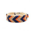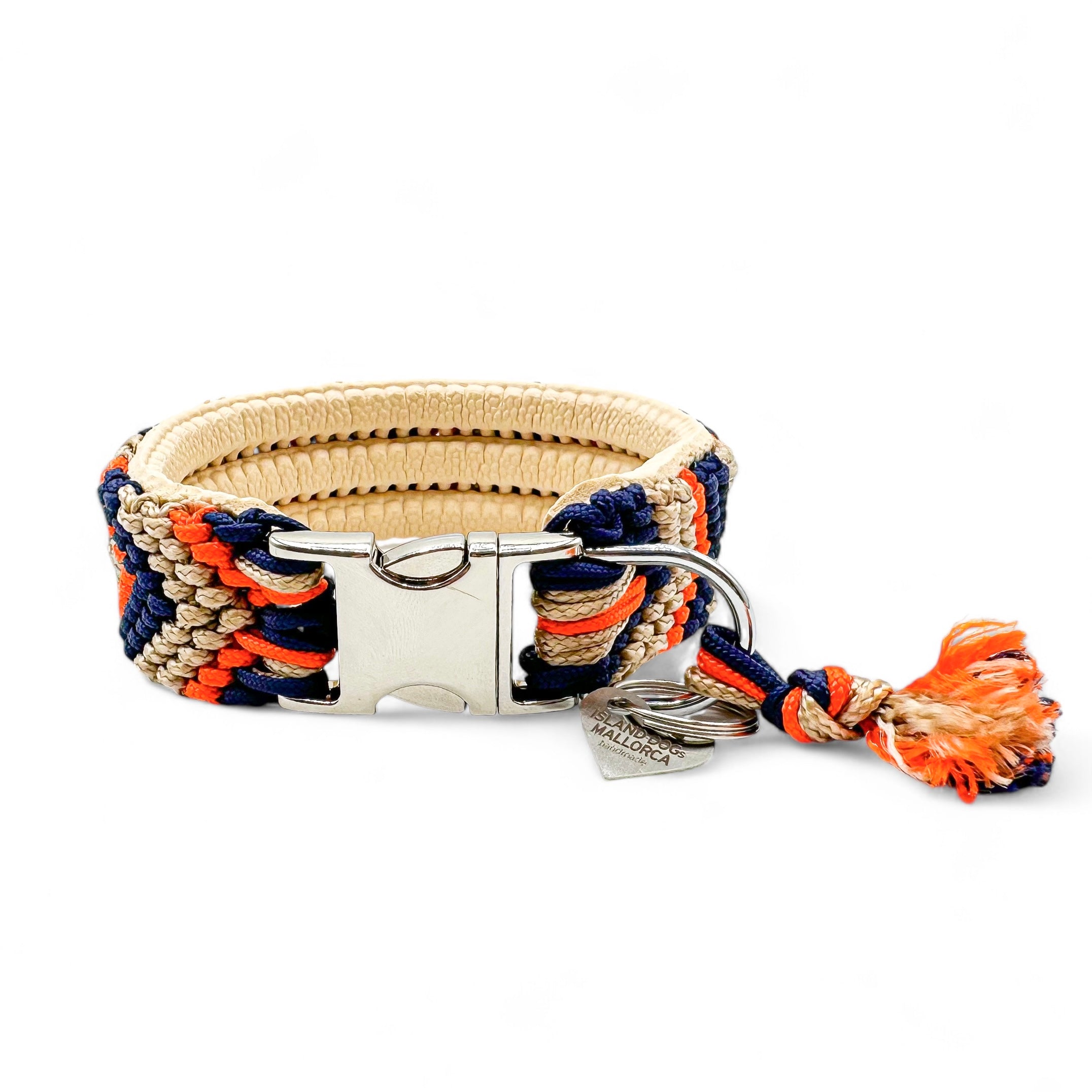 Das Halsband auf dem Bild hat eine Breite von 3 cm und besteht aus hangeknüpften Paracordbandmuster in Pfeiloptik. Insgesamt wurden hier die 3 Farben Marine Blau, Beige und Fire Orange verarbeitet. Zusätzlich wurde das Halsband mit einer super weichen Polsterung in der Farbe Cream unterlegt und bietet so einen super angenehm Tragekomfort. Wenn du eine Leine wählst, passen wir diese farblich dem Halsband an und die Optik der Leine ist wie die unserer Tau Designs.
