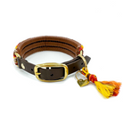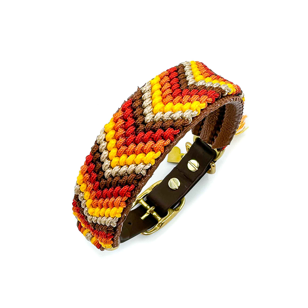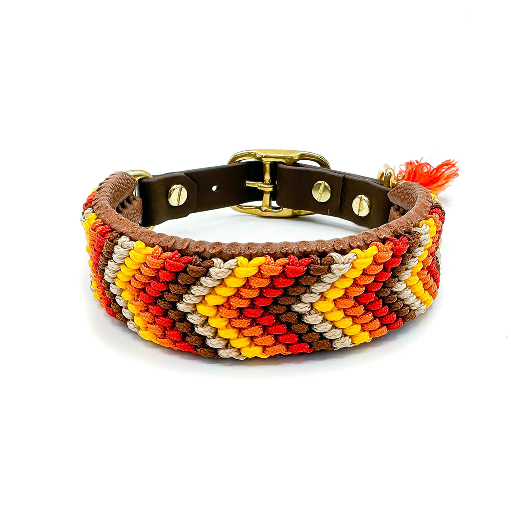 Das Halsband auf dem Bild hat eine Breite von 3 cm und besteht aus hangeknüpften Paracordbandmuster in Pfeiloptik. Insgesamt wurden hier die 5 Farben Chilli Red, Chocolate Braun, Fox Orange, Beige und Honey verarbeitet. Zusätzlich wurde das Halsband mit einer super weichen Polsterung in der Farbe Cream unterlegt und bietet so einen super angenehm Tragekomfort. Wenn du eine Leine wählst, passen wir diese farblich dem Halsband an und die Optik der Leine ist wie die unserer Tau Designs.